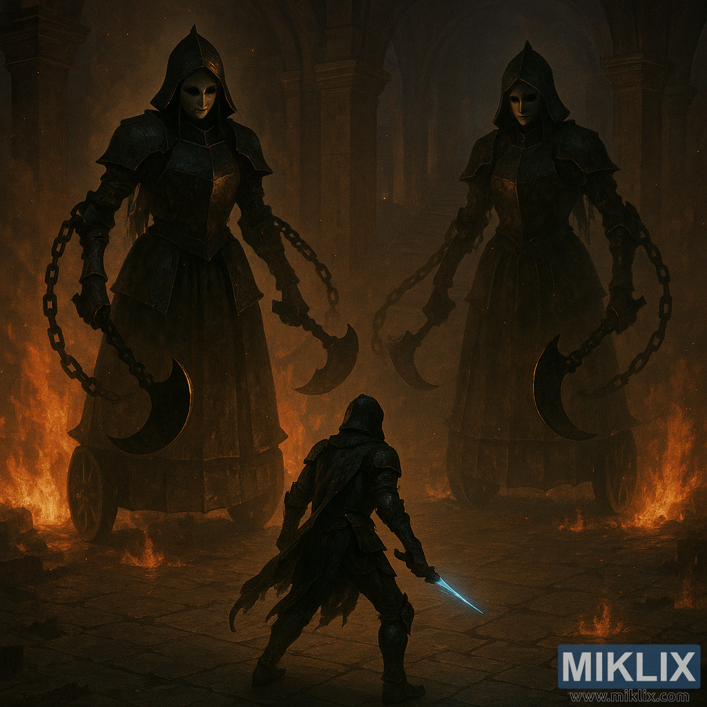 Qara Bıçağın Qara Bıçaqla üz-üzə qaldığı qismən tünd fantaziya səhnəsi, alovlu dağıntılar arasında iki Qaçırılmış Bakirə qızla qarşı-qarşıya gəlir, təkmilləşdirilmiş görünürlük və dramatik işıqlandırma ilə.