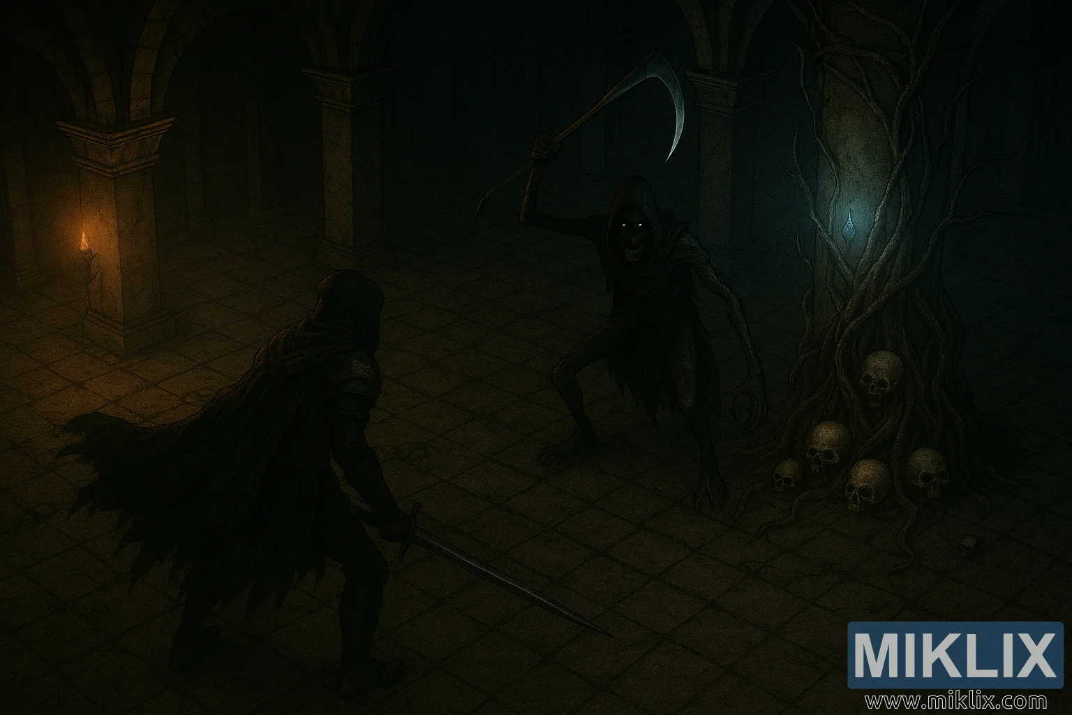 Məxluqun sağ tərəfində, burulmuş köklər hündür bir daş sütunu əhatə edir və döşəməyə spektral kölgələr salan solğun mavi işıq saçır. Sütunun dibində köklərin arasında insan kəllələri toplusu görünür. Uzaqdakı sütuna quraşdırılmış tək bir məşəl, köklərin soyuq parıltısı ilə ziddiyyət təşkil edən isti, titrəyən işıq verir.
