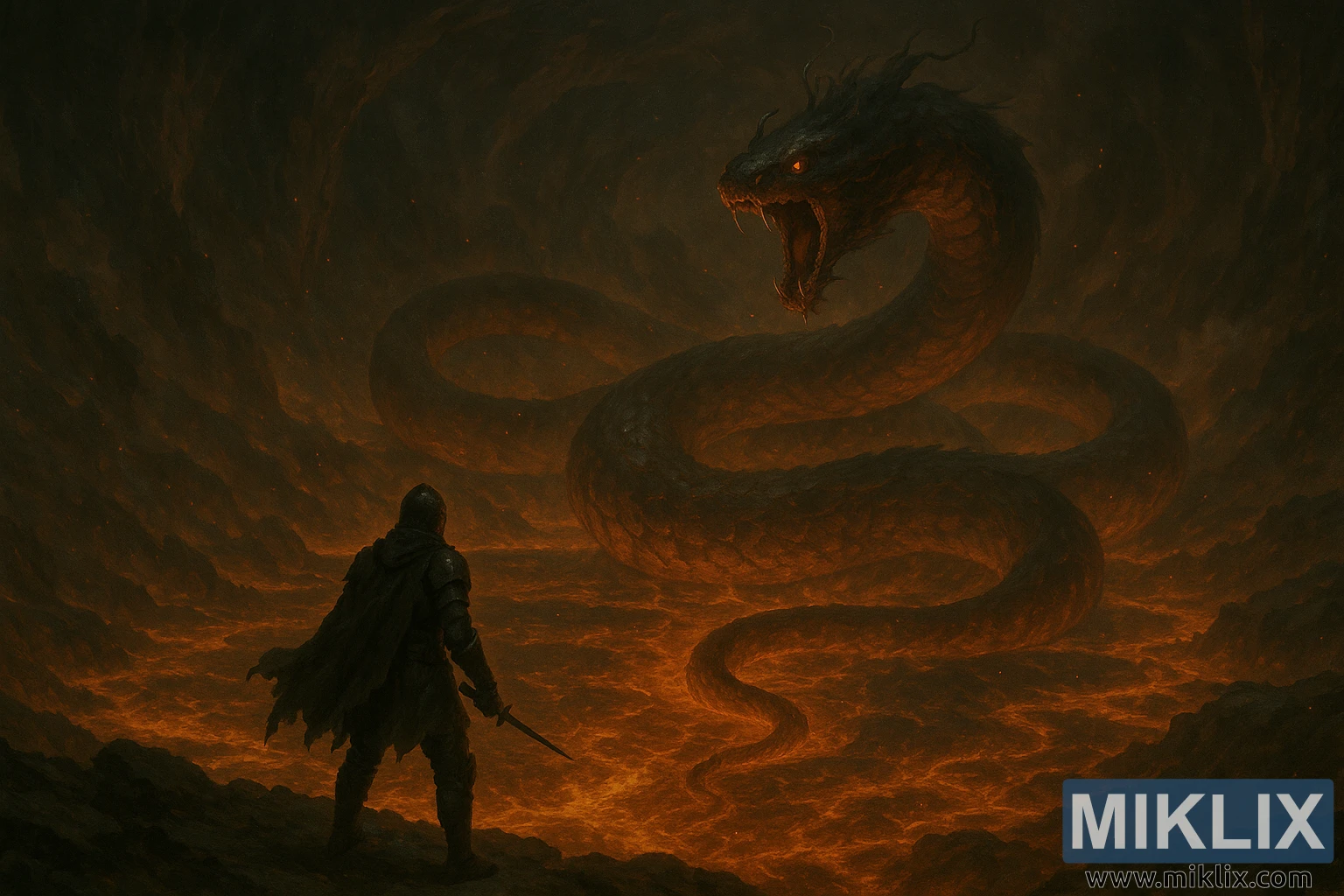 Bu sənət əsəri qeyri-mümkün bir qarşıdurmanın - vulkanik mağaranın dərinliklərində dağ kimi miqyaslı ilanın qarşısında tək dayanan kiçik bir qaralmış döyüşçünün əhatəli, kino görünüşünü təqdim edir. Kamera qaldırılır və geri çəkilir, izləyicini allaha bənzəyən baxış nöqtəsinə çevirir, yeraltı dünyasının bütün nəhəngliyini artırır. Buradan səhnə müşahidə xarakteri daşıyır, az qala mifikdir: məhvin kənarında donmuş bir an.