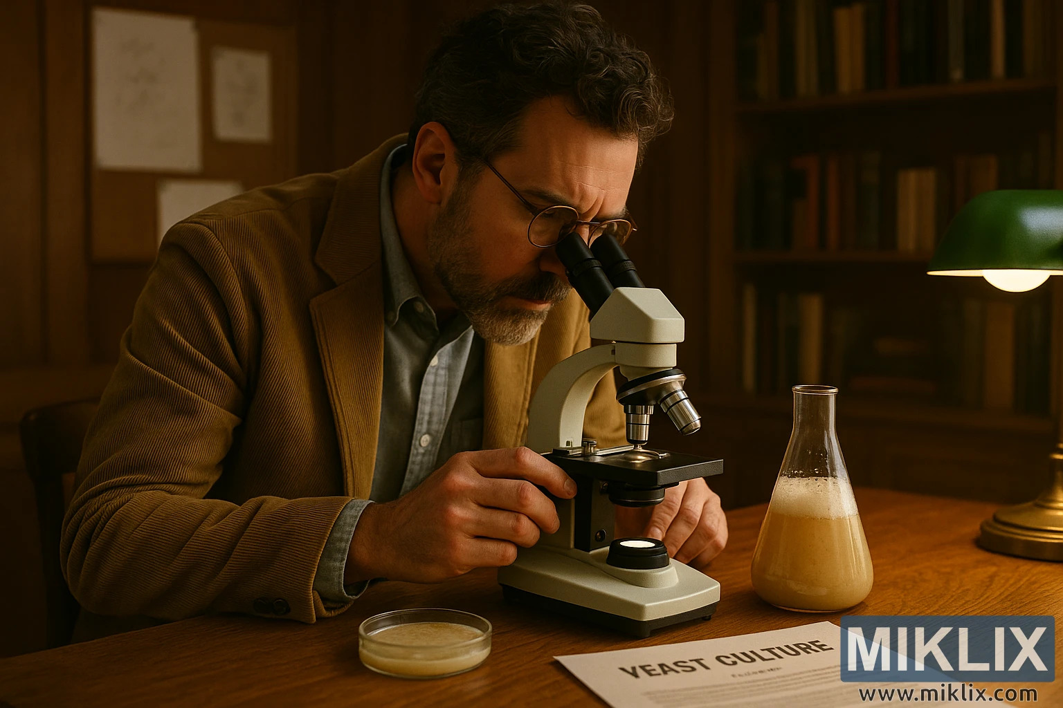 Fotoşəkil elm və rahatlığın bir-birinə qarışdığı, həm çalışqan, həm də cəlbedici bir atmosfer yaradan, hərarətlə işıqlandırılmış akademik mühit təqdim edir. Şəklin mərkəzində mürəkkəb mikroskop altında maya kulturunun tədqiqi kimi vasvası hərəkətə dərindən qarışmış orta yaşlı bir alim oturur. Onun boz rəngli tünd qəhvəyi buruq saçları və səliqəli saxlanmış saqqalı ilə çərçivəyə salınmış sifəti intensiv diqqəti əks etdirir. Dairəvi eynəklər burnunun üstündə dayanır, linzaları yaxınlıqdakı stolüstü lampanın yumşaq parıltısını tutur. Onun bədən dili, aləti diqqətlə tənzimləyən əlləri ilə irəli əyilib, müşahidə etdiyi kiçik canlı dünyaya ehtiramla məhdudlaşan bir fədakarlığı ifadə edir.