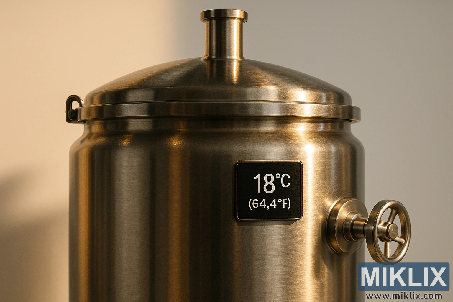 Əsas çən gövdəsinin yan tərəfinə yapışdırılmış ən vacib məlumat elementidir: kiçik, qara, kvadrat rəqəmsal displey paneli. Bu panel cari daxili temperaturun dəqiq oxunmasını təmin edir: 18∘C (64,4∘F). Bu oxunuşun aydınlığı və qabarıqlığı pivəbişirmə prosesində temperatur nəzarətinin böyük əhəmiyyətini vurğulayır, xüsusən də müəyyən bir maya ştammının mürəkkəb həyat dövrü və ləzzət profilinin yaradılmasını idarə edərkən. Bu xüsusi temperatur diapazonu çox vaxt müəyyən ale mayaları üçün arzuolunan efirləri istehsal etmək və qeyri-dadlar yaratmadan sabit, sağlam fermentasiyanı saxlamaq və ya "isti-lager" diapazonunda fermentasiya edilən lager mayaları üçün optimaldır. Ekranın özü müasir və aydındır, tankın içərisində dəqiq, rəqəmsal olaraq nəzarət edilən şəraitə kiçik bir pəncərədir.