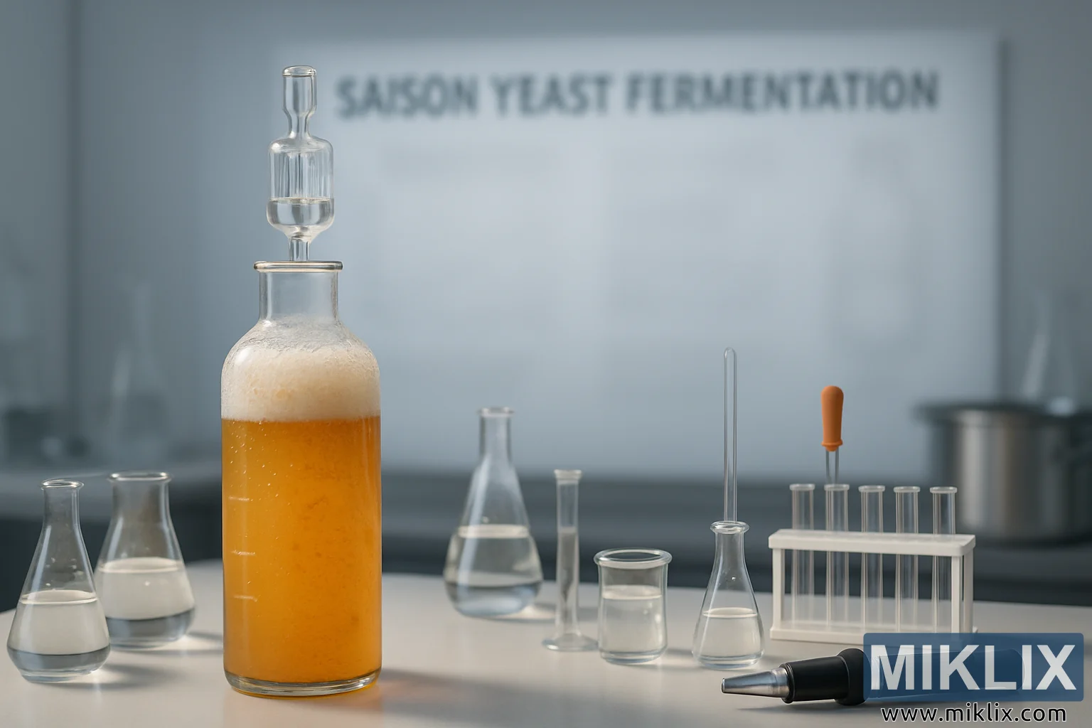 Maya tədqiqatı üçün parlaq, klinik işıqlandırma altında fermentasiya edən Saison qabı, şüşə qablar və alətlər ilə müasir laboratoriya səhnəsi.