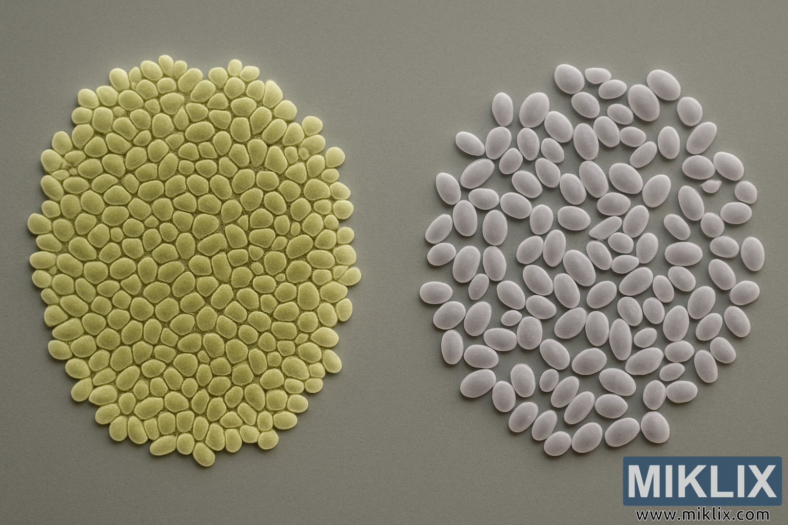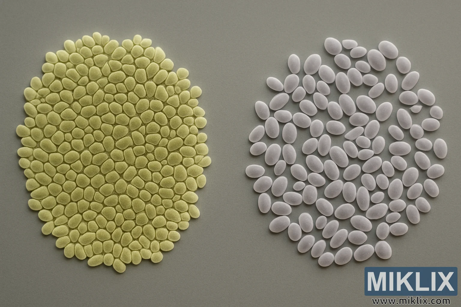 Bunun əksinə olaraq, şəklin sağ tərəfində daha dağınıq və açıq olan maya koloniyası var. Hüceyrələr ümumi oval formada oxşardır, lakin fərqli bir rəng göstərir: onları sol koloniyanın sarı-yaşılından dərhal fərqləndirən soyuq, solğun yasəmən-boz tonu. Daha boş tənzimləmə, ayrı-ayrı hüceyrələr arasındakı sərhədləri daha aydın edir, izləyiciyə solda görünən izdihamlı mozaika olmadan onların fərqli formalarını qiymətləndirməyə imkan verir. Bu boşluq daha az aqressiv şəkildə flokulyasiya edən, çökmədən əvvəl mayedə daha uzun müddət asılmış vəziyyətdə qalan gərginliyi nəzərdə tutur. Daha açıq rəngləmə və daha yumşaq kölgəlik hər bir hüceyrənin fərdiliyini vurğulayır, aralarındakı səpələnmiş boşluqlar isə paylanma müxtəlifliyini və bəlkə də böyümə modellərindəki fərqləri vurğulayır. Sağ tərəfdəki klaster sol koloniyanın sıx möhkəmliyi ilə müqayisədə havadar və daha incə hiss edir.
