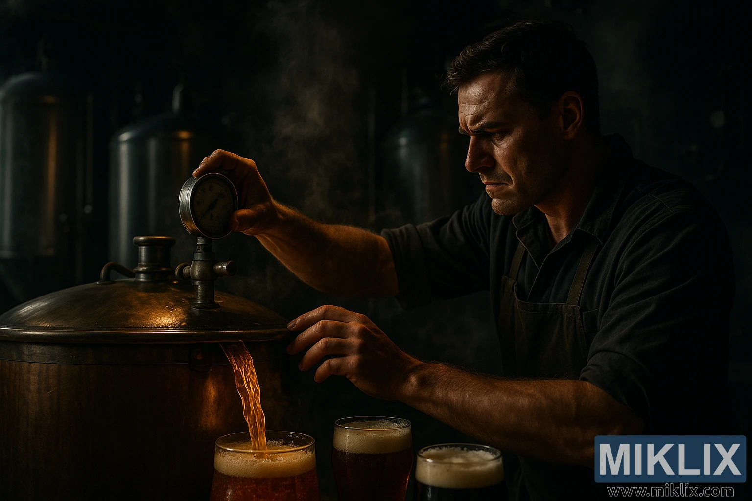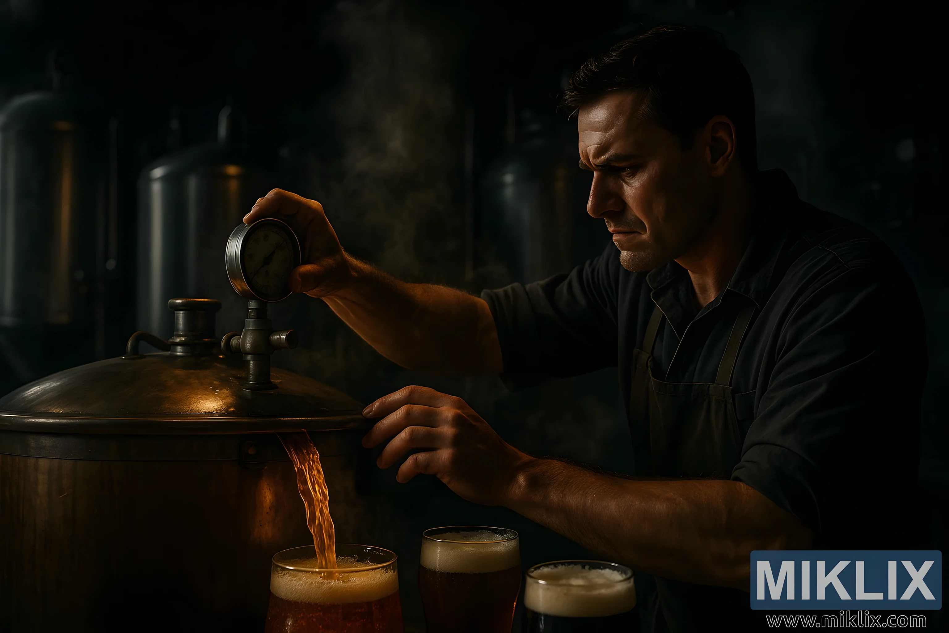 Pivə istehsalçısı buxarlı pivəxanada kəhrəba şərabı axan kimi ölçünü dəqiqləşdirir, Agnus mayaotu ilə dəmlənmənin dəqiqliyini və sənətkarlığını vurğulayır.
