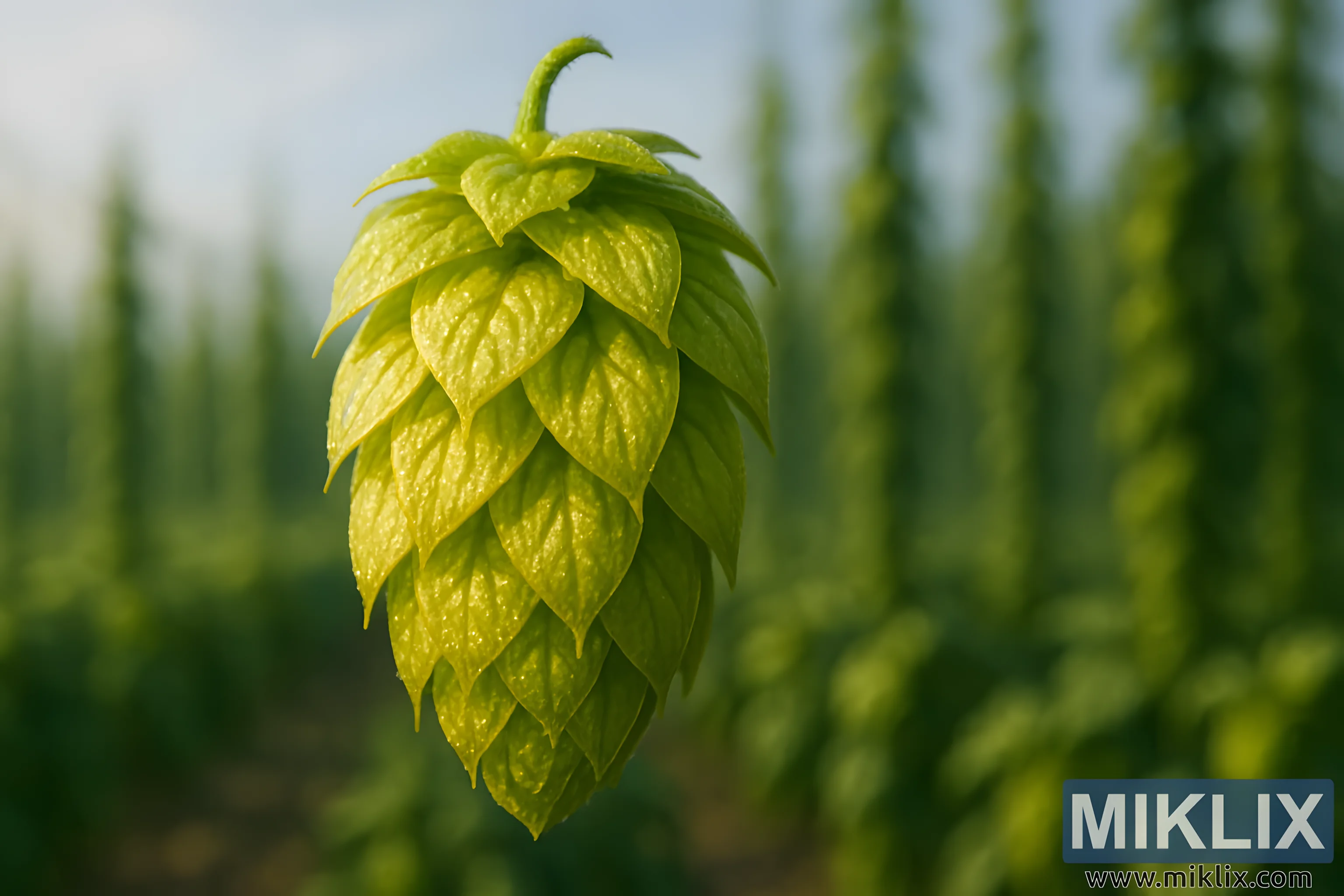 Fotoşəkil dərhal diqqəti ön planda asılmış, kənardakı hop sahəsinin yumşaq bulanıqlığına qarşı təəccüblü aydınlıqda olan tək hop konusuna çəkir. Təbii işıqla yuyulan konusun qızılı-yaşıl bürcləri qüsursuz simmetriya ilə üst-üstə düşür, onların sivri ucları təbii spiral şəklində yumşaq aşağı daralır ki, bu da həm zərif, həm də funksional görünür. Hər bir miqyas günəşin parıltısı altında demək olar ki, şəffaf görünür, damarların və kənarların incə teksturaları dəqiqliklə ortaya çıxır. Konus canlı, təravətli və vədlə canlıdır, Kaliforniya Cluster çeşidinin mahiyyətini təcəssüm etdirir, həm tarixi çəki, həm də pivəbişirmədə davamlı aktuallıq daşıyan hopdur.