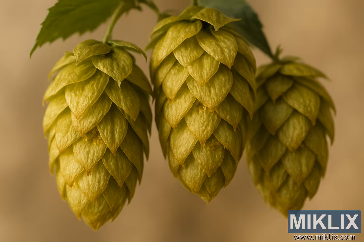 Şəkildə mürəkkəb botanika quruluşunu vurğulayan yumşaq, təbii işıqda çəkilmiş yetişmiş Talisman hop konuslarının heyrətamiz, yüksək dəqiqlikli yaxın planı təqdim olunur. Çərçivənin mərkəzi fokusunu üç əsas konus tutur, təsvirin yuxarı hissəsindən uzanan incə yaşıl gövdələrdən asılır. Onların üst-üstə düşən bracts simmetriya və üzvi nizam hissi yaradaraq səliqəli şəkildə düzülmüş tərəzilərdə aşağıya doğru şəlalələnən sıx laylı, konusvari bir quruluş meydana gətirir. Konuslar incə detallarla işlənib, onların səthləri onlara canlı, toxunma keyfiyyəti verən incə damarlarla tekstura olunub. Hər bir brakt kənarlardakı qızılı-yaşıl rəngdən tutmuş daxili qıvrımlara doğru bir qədər dərin zeytun və əhəng çalarlarına qədər incə ton dəyişiklikləri göstərir. Rənglərin bu qarşılıqlı əlaqəsi dərinlik hissini artırır, konuslara ölçülü, demək olar ki, heykəltəraşlıq görünüşü verir.