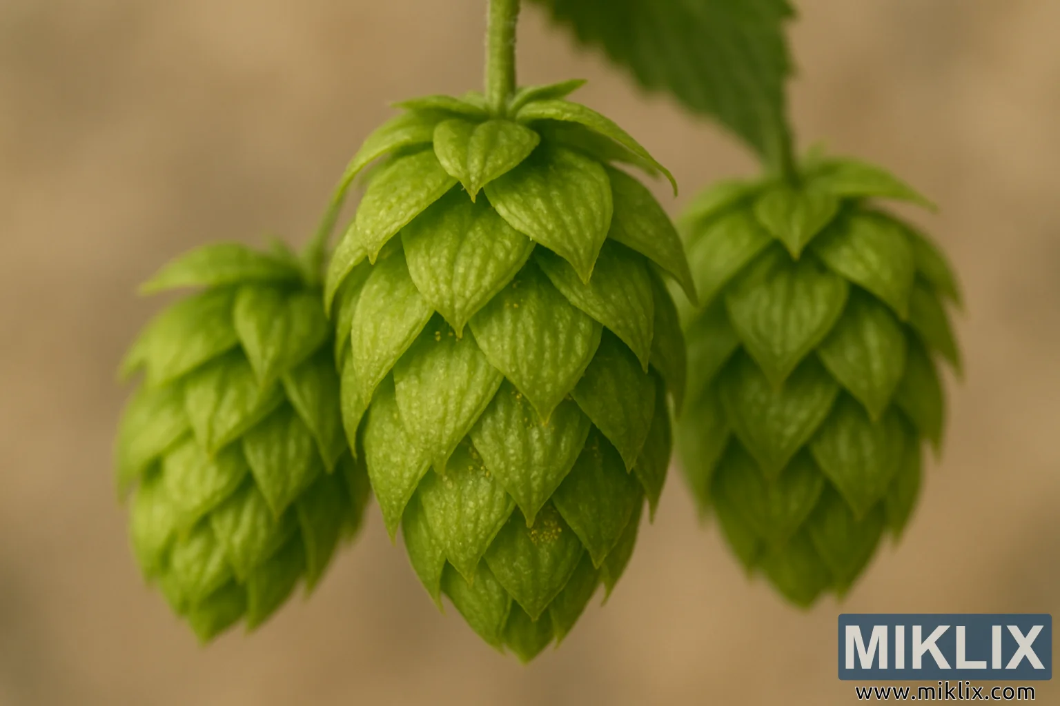 Fon zərif şəkildə bulanıq, isti, neytral bej tonlarında işlənmişdir. Bu bokeh effekti hop konuslarını hər hansı potensial yayındırmalardan təcrid edir və makro fotoqrafiyaya xas olan sahə dərinliyini vurğulayır. Çərçivənin yuxarı kənarında dişli yarpağın zəif bir işarəsi görünə bilər, konusları bitki mühitində kontekstləşdirərək, itaətkar və müdaxilə etmədən qalır. Sahənin dayaz dərinliyi tamaşaçının baxışlarının konusların özlərinin mürəkkəb struktur gözəlliyində sabit qalmasını təmin edir.