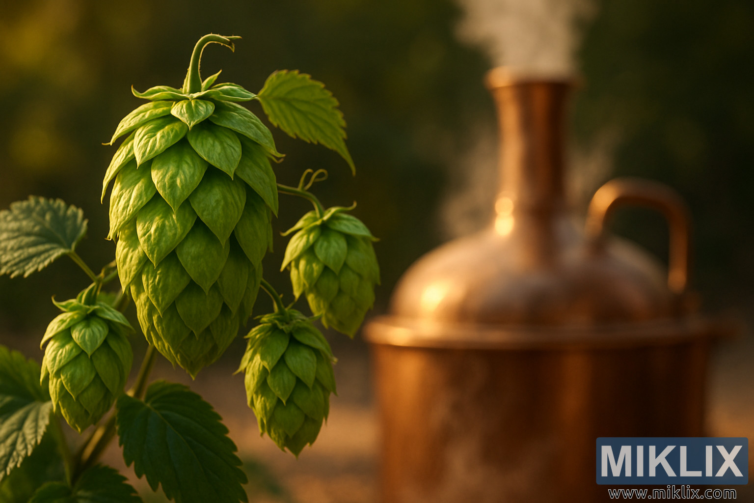Şəkil pivə istehsalının iki mərkəzi ikonasını bir araya gətirərək həm zamansız, həm də intim hiss edən anı əks etdirir: hop konusunu və mis çaydanı. Ön planda Yakima Cluster şerbetçiotu tam yetkinlik dövründə asılır, onların dolğun, üst-üstə düşən pulcuqları sanki həyat saçan konusvari formalar əmələ gətirir. Hop konusları zərif braktların kənarlarında solğun əhəngdən tutmuş, lupulin vəzilərinin gizləndiyi əsaslarında daha dərin, demək olar ki, zümrüd tonlarına qədər yaşıl çalarlarla parlayır. Göydə alçaq olan günəş işığı səhnəyə isti qızılı parıltı verir, şerbetçiotu elə işıqlandırır ki, hər bir miqyas demək olar ki, şəffaf görünür və içəridə sıxılmış yapışqan, qatranlı yağlara işarə edir. Onların mövcudluğu həm botanika, həm də aromatikdir, tezliklə buraxacaqları ləzzətlərin açıqlanmayan vədidir: yaxşı hazırlanmış IPA-nın xarakterini müəyyən edən torpaq, ədviyyatlı və incə sitrus notları.