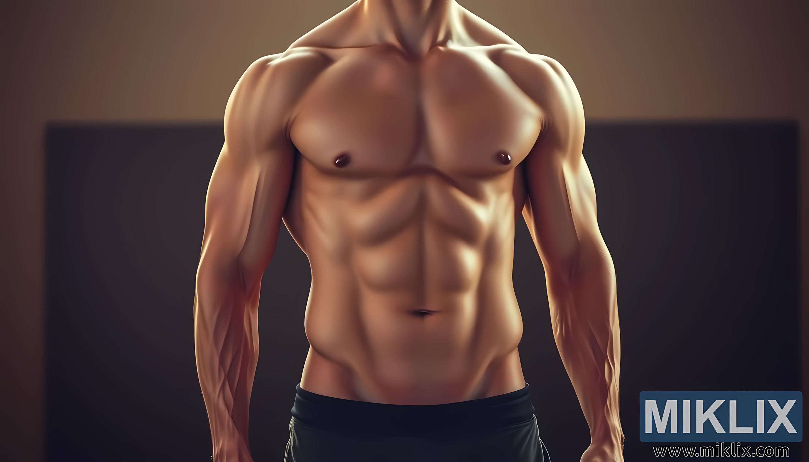 Şəkil bədən quruluşu gücü, nizam-intizamı və zirvə kondisionerini təcəssüm etdirən kişi fiqurunun əmredici vizualını təqdim edir. Dik dayanaraq, onun bədəni simmetriya və əzələ tərifinə vurğu ilə nümayiş etdirilir, hər bir kontur diqqətlə yerləşdirilmiş işıqlandırma ilə vurğulanır. Onun qarnı ciddi məşq və pəhrizə ciddi diqqətin nəticəsi olan kəsilmiş altı paketi ortaya qoyur, döş əzələləri isə yuxarıda balanslaşdırılmış çərçivə yaradır. Arıq əzələ və sinir ilə bağlanmış qollar həm dözümlülüyü, həm də gücü maksimuma çatdırmaq üçün hazırlanmış saatlarla davam edən müqavimət təlimini əks etdirərək həm güc, həm də damar qabiliyyətini nümayiş etdirir. Sakitlikdə belə, fiqur sakit bir intensivlik yayır, sanki hər bir əzələ sərbəst buraxılmağı gözləyən potensial enerji ilə canlıdır.