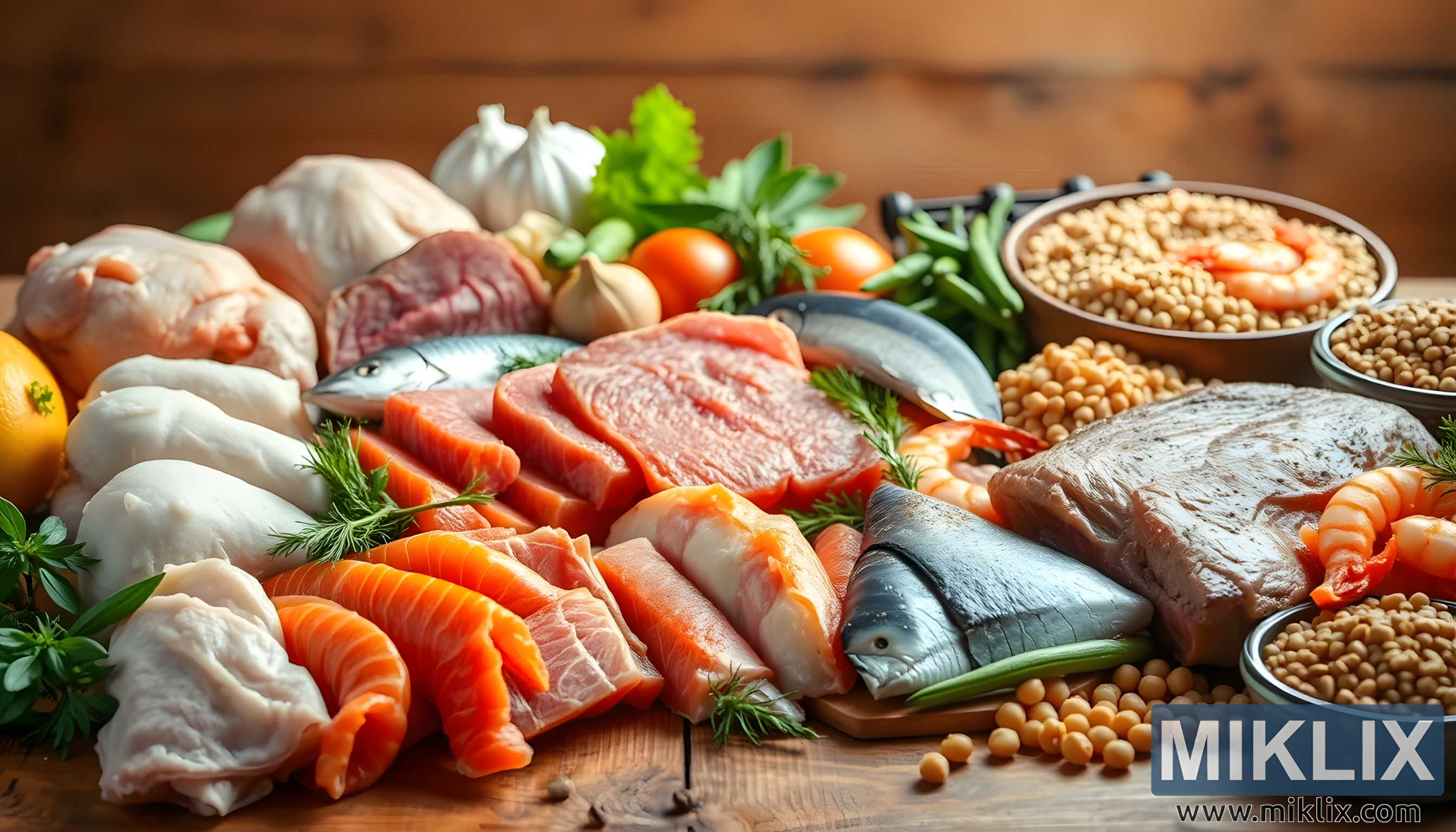 Beta alaninlə zəngin ət, dəniz məhsulları və bitki mənşəli qidalardan ibarət natürmort, köntöy masada qidalanma və təbii teksturaları vurğulayır.
