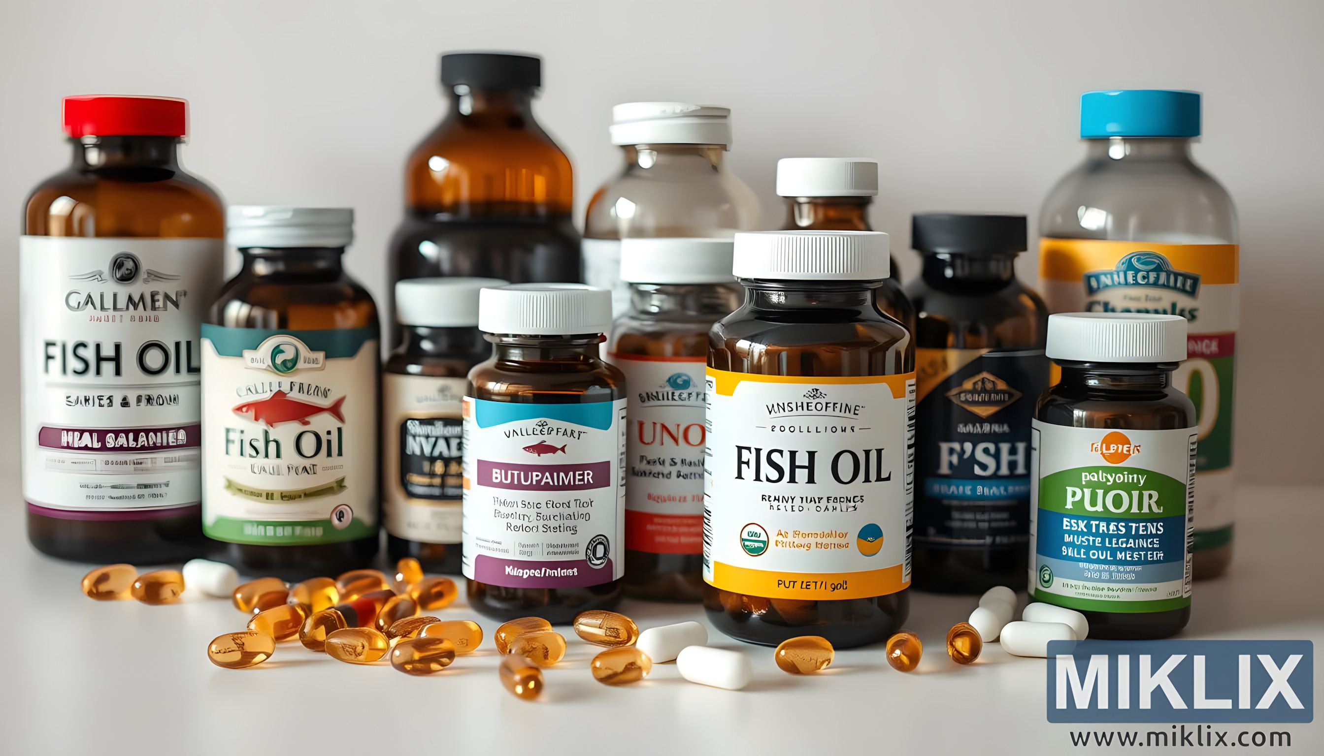 Mövcud əlavələrin müxtəlifliyini və diqqətlə seçilməsini vurğulayan balıq yağı şüşələri və kapsullarının yüksək keyfiyyətli təsviri.