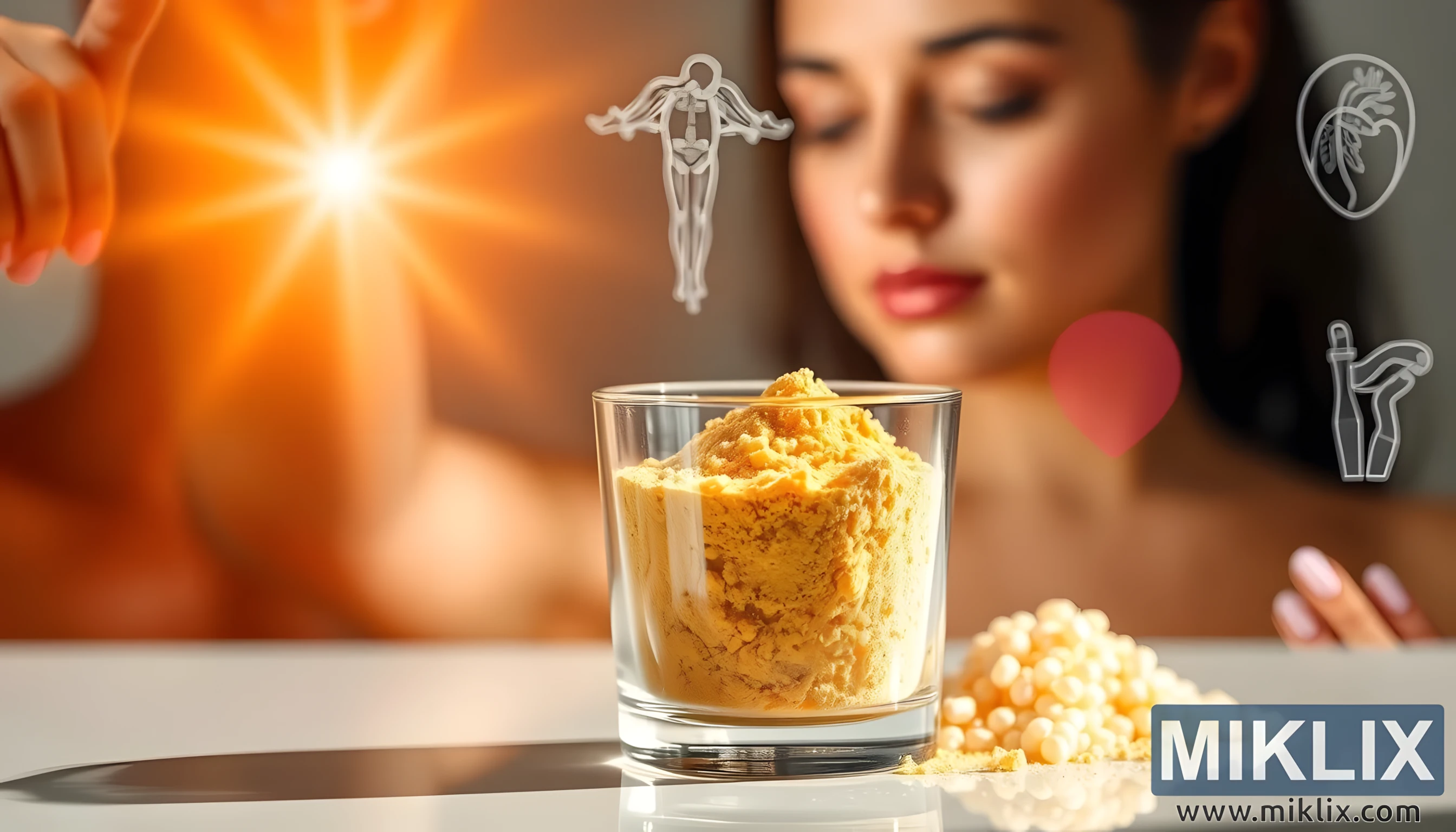 Şəkil, elmi aydınlığı sağlamlıq və canlılıq atmosferi ilə mükəmməl birləşdirən şəkildə təqdim edilmiş kollagen əlavəsinin faydalarının vizual olaraq cəlbedici tədqiqini təqdim edir. Kompozisiyanın mərkəzində, ön planda qızıl kollagen tozu ilə dolu şəffaf şüşə dərhal diqqəti cəlb edir. Toz incə teksturalıdır və isti parıltı ilə yuyulur, onun parlaq rəngi saflıq, enerji və qidalanmadan xəbər verir. Şüşənin altındakı hamar əks etdirici səth zəriflik və təmizlik təəssüratını artırır, demək olar ki, klinik dəqiqlik hissini oyadır, eyni zamanda sağlamlıq ritualının istiliyini və rahatlığını saxlayır. Yaxınlıqda səpələnmiş parlaq kollagen kapsulları var, onların mirvari parıltısı tutqun tozla ziddiyyət təşkil edir və kollagenin müxtəlif yollarla istehlak edilə biləcəyini əks etdirən ahəngdar bir cüt yaradır - istər içki qarışıqlarında, istərsə də əlavələr kimi.