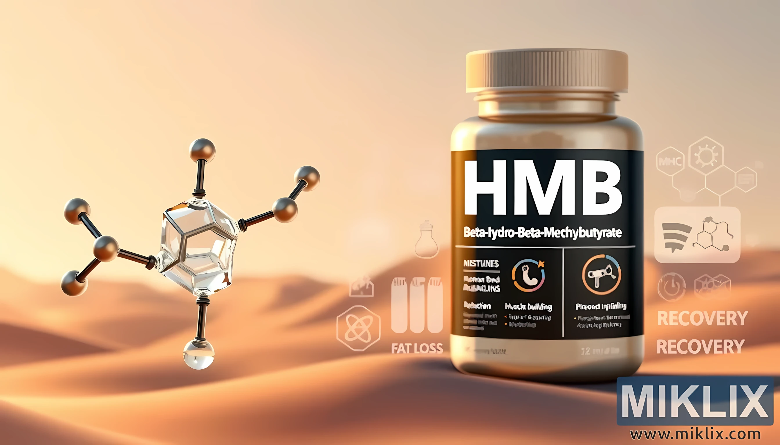 Şəklin fonu isti axşam işığı altında səhra qum təpələrini xatırladan yumşaq axan qradientlə atmosfer kontrastını yaradır. Bu isti, təbii parıltı bütün səhnəni yuyur, canlılıq, yenilənmə və enerji hissi verir, bütün keyfiyyətlər əlavə vədlərə uyğun gəlir. Qradiyent dizaynı dərinlik və ölçü təmin edir, kimyəvi formulların, stəkandaların və digər tədqiqatdan ilhamlanmış qrafiklərin zəif konturları məhsulun arxasında duran ciddi elm və innovasiyaya incə bir işarə verir. Təbii və texniki elementlərin bu qarşılıqlı təsiri HMB-nin həm təbiət proseslərinin məhsulu, həm də müasir elmi incəlik kimi ikili şəxsiyyətini vurğulayır.