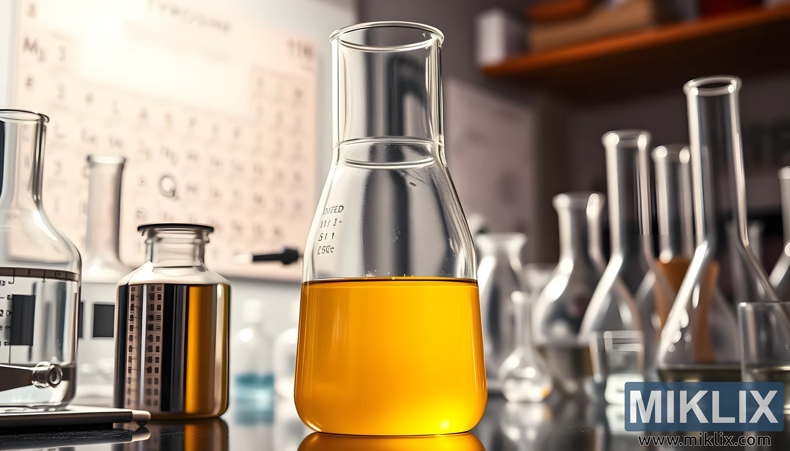 Bu şəkil elmi kəşfiyyatın və biokimyəvi dəqiqliyin mahiyyətini əks etdirir, qızılı-sarı mayenin tək bir stəkanının diqqət mərkəzinə çevrildiyi diqqətlə tərtib edilmiş laboratoriya mənzərəsini təqdim edir. Təmiz, bucaqlı xətləri olan şəffaf şüşədən hazırlanmış stəkan kompozisiyanın mərkəzində inamla dayanır, onun parlaq məzmunu yumşaq, yayılmış işığın zərif nəvazişi altında parlayır. Mayenin rəngi canlılıq və enerjini xatırladan istilik yayır və dərhal gözü çəkir. Bu canlı rəng həm hərfi təfərrüat, həm də simvolik metafora rolunu oynayır və tirozin kimi birləşmələrin biokimya və insan fiziologiyasının daha geniş çərçivələrində dinamik və əsas rolunu təklif edir. Qabın aydınlığı şəffaflığı və dəqiqliyi, elmi metodun özünün dəyərlərini əks etdirən atributları vurğulayır.