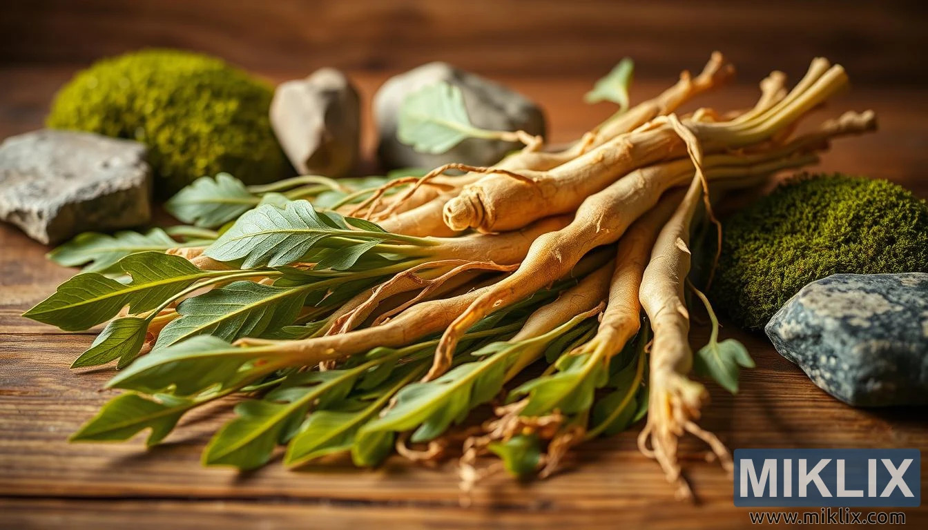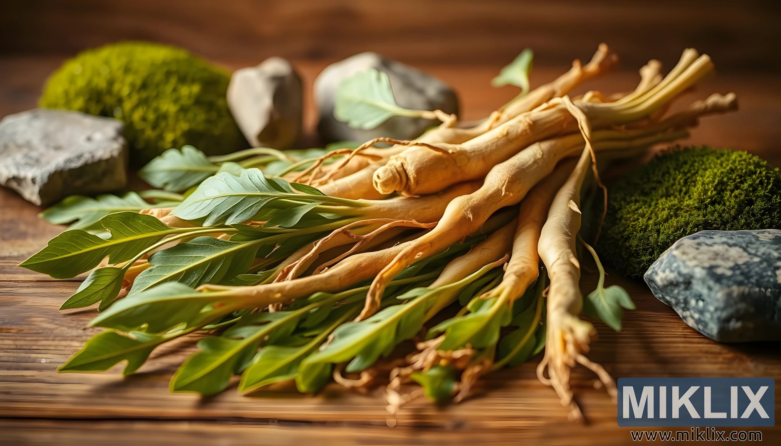 Təzə jenşen kökləri və yarpaqlarının təbii elementləri olan taxta masa üzərində yaxından çəkilişi, otun torpaq, müalicəvi faydalarını vurğulayır.