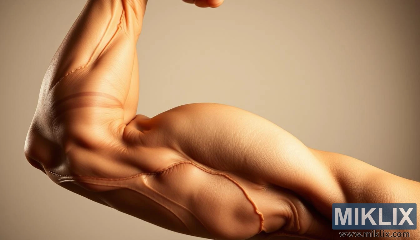Əzələlərin böyüməsi və bərpasında gücü və kazein zülalının rolunu vurğulayan vətərləri və əzələləri üzə çıxaran əyilmiş qolun yaxından görünüşü.