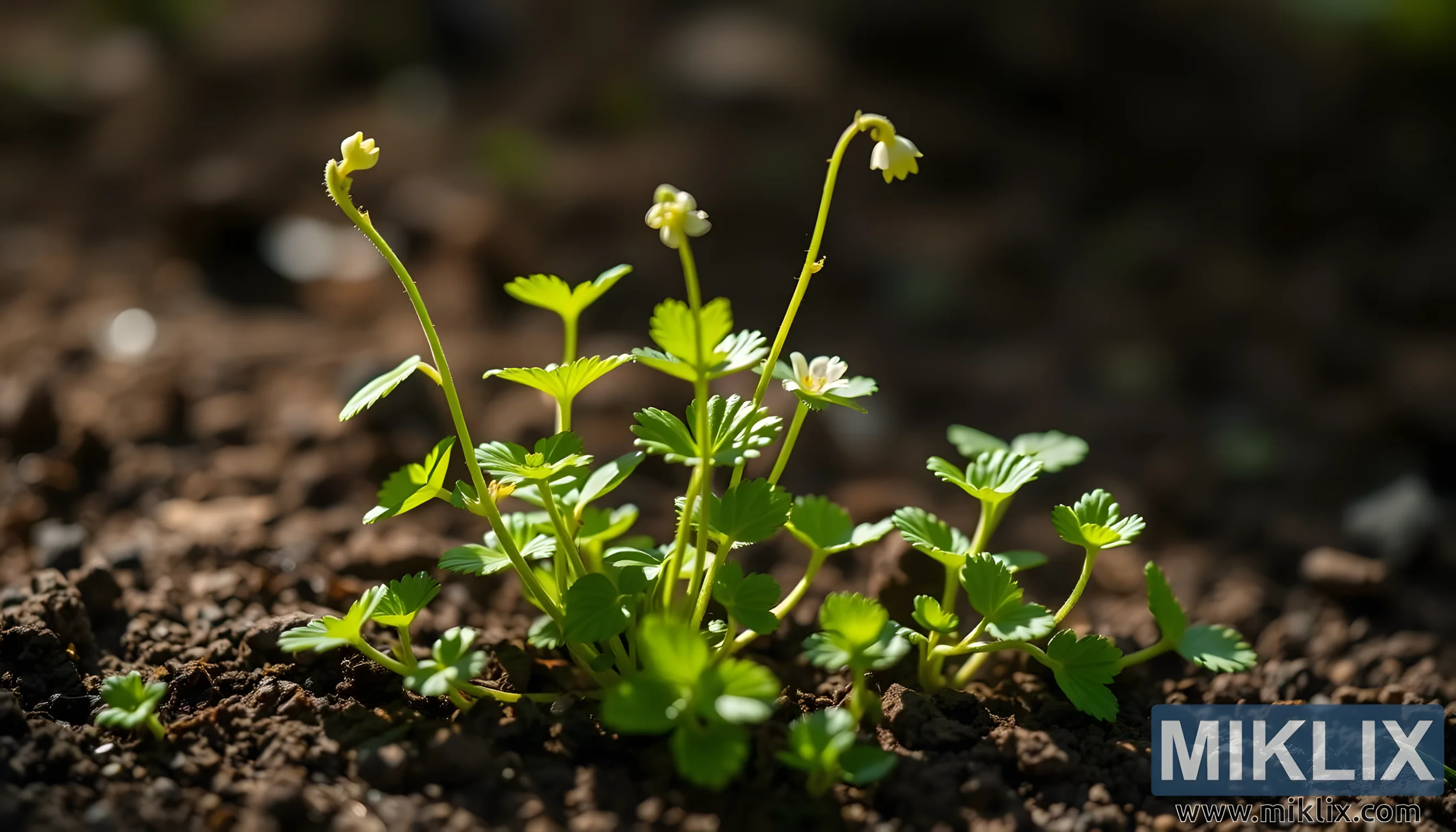Fotoşəkil qaranlıq, qidalandırıcı torpaqdan zərif şəkildə çıxan gənc Bacopa monnieri bitkisinin incə və intim görünüşünü əks etdirir. Onun incə gövdələri zərif şəkildə yuxarı qalxır, təbii bir əyri şəkildə əyilir, demək olar ki, çəkisiz görünən kiçik ağ çiçəklərlə taclanır, ləçəkləri işığın yumşaq nəvazişini tutur. Yarpaqlar kiçik, lakin canlıdır, hər biri kənarları boyunca incə dişlərlə naxışlıdır, onların parlaq yaşıl çalarları altındakı zəngin, torpaq tonları ilə təəccüblü kontrast yaradır. Bitki və onun ətrafı arasında qarşılıqlı əlaqə həyat və yerin sakit dayanıqlıq içində birlikdə mövcud olduğu harmonik tarazlıq yaradır. Çərçivə boyunca zərif şəkildə süzülən təbii işıqlandırma bitkinin mürəkkəb strukturlarını - onun incə gövdələrini, yarpaqlarının parıldayan səthini və yuxarıda yumşaq yellənən kövrək çiçəkləri vurğulayır. Kölgələr torpağa yüngülcə düşür, bitkinin üçölçülü varlığını artırır və ona dərinlik və canlılıq hissi verir.