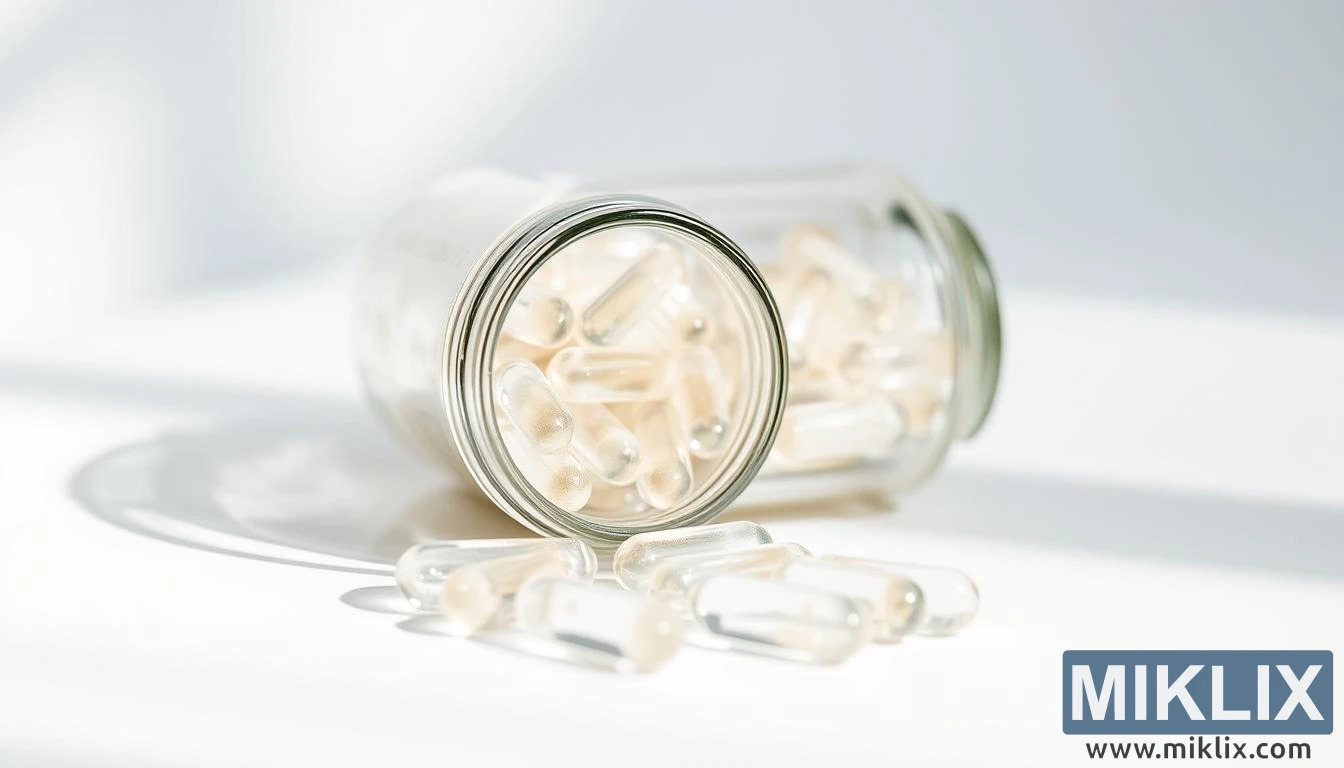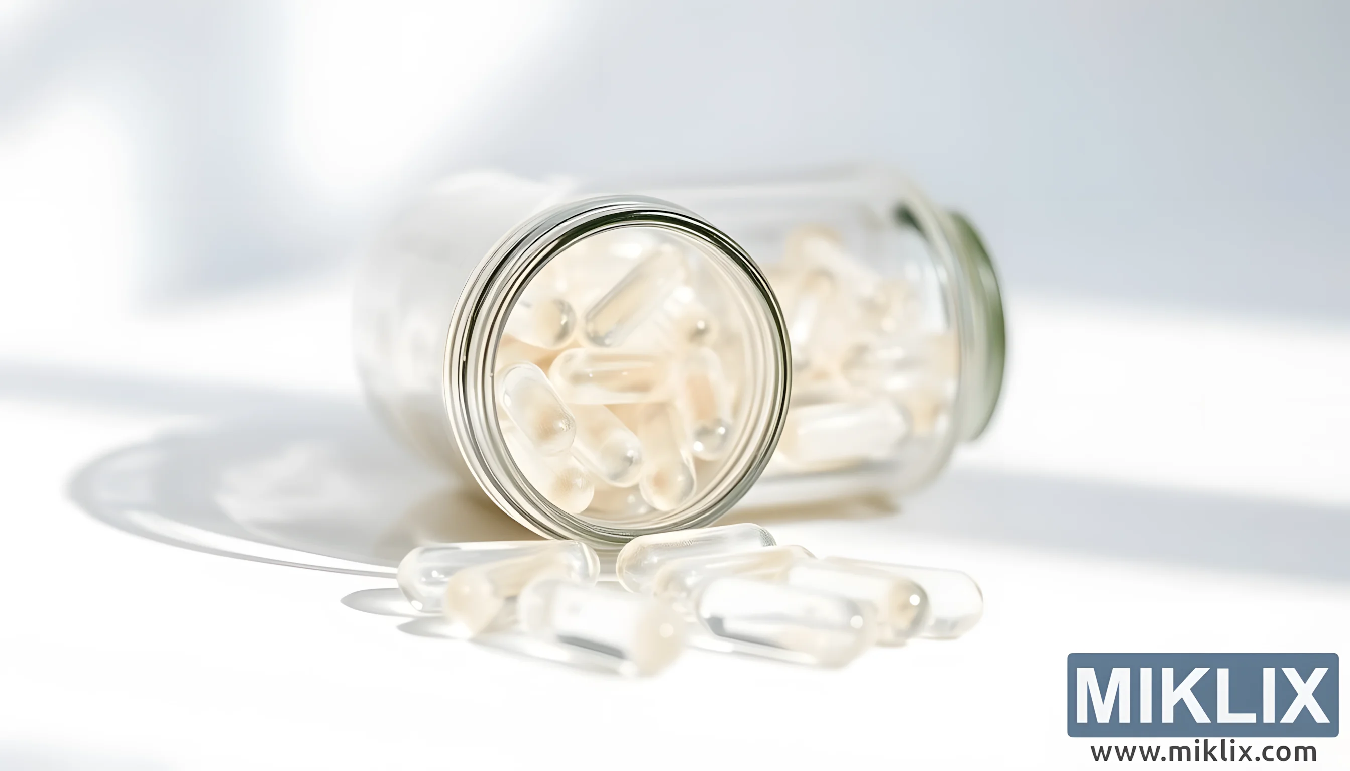 Təmiz, səliqəsiz fon seçimi kompozisiyanın vizual və simvolik gücünü artırmağa xidmət edir. Diqqəti yayındırmadan tamaşaçının baxışları təbii olaraq kapsullara yönəlir, onların təmiz görünüşü parlaq genişlik qarşısında cəsarətlə seçilir. Kavanoz, formaca sadə olsa da, diqqətli qorunma hissi və müasir dizayn, şəffaflığı məzmunun görünən və povestin mərkəzində qalmasını təmin edir. Bu şəffaflıq, kapsulların özlərinin aydınlığı ilə birləşərək, həm məhsulun bütövlüyündə, həm də sağlamlıq və qidalanma kontekstində açıqlıq ideyasını vurğulayır.