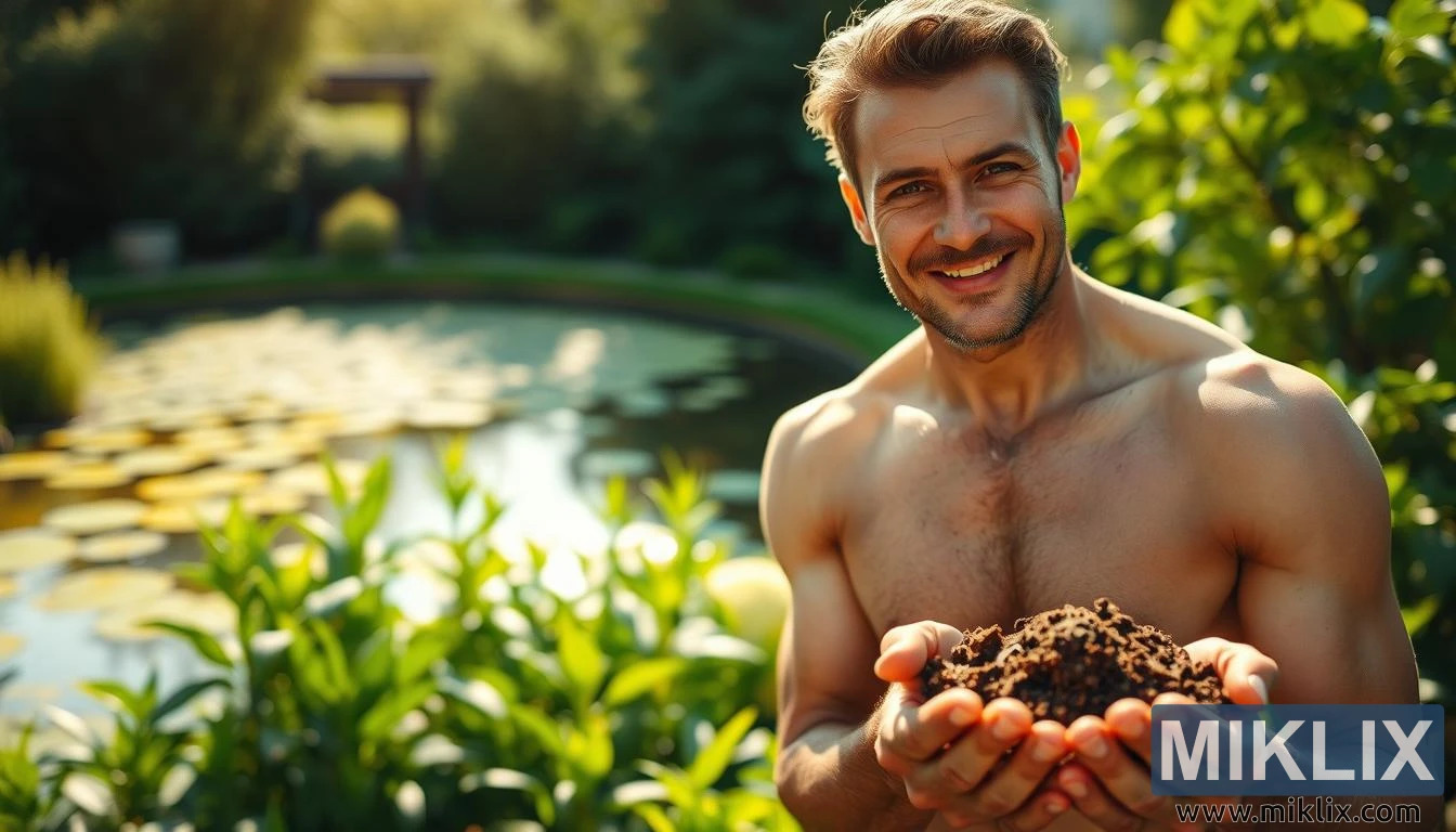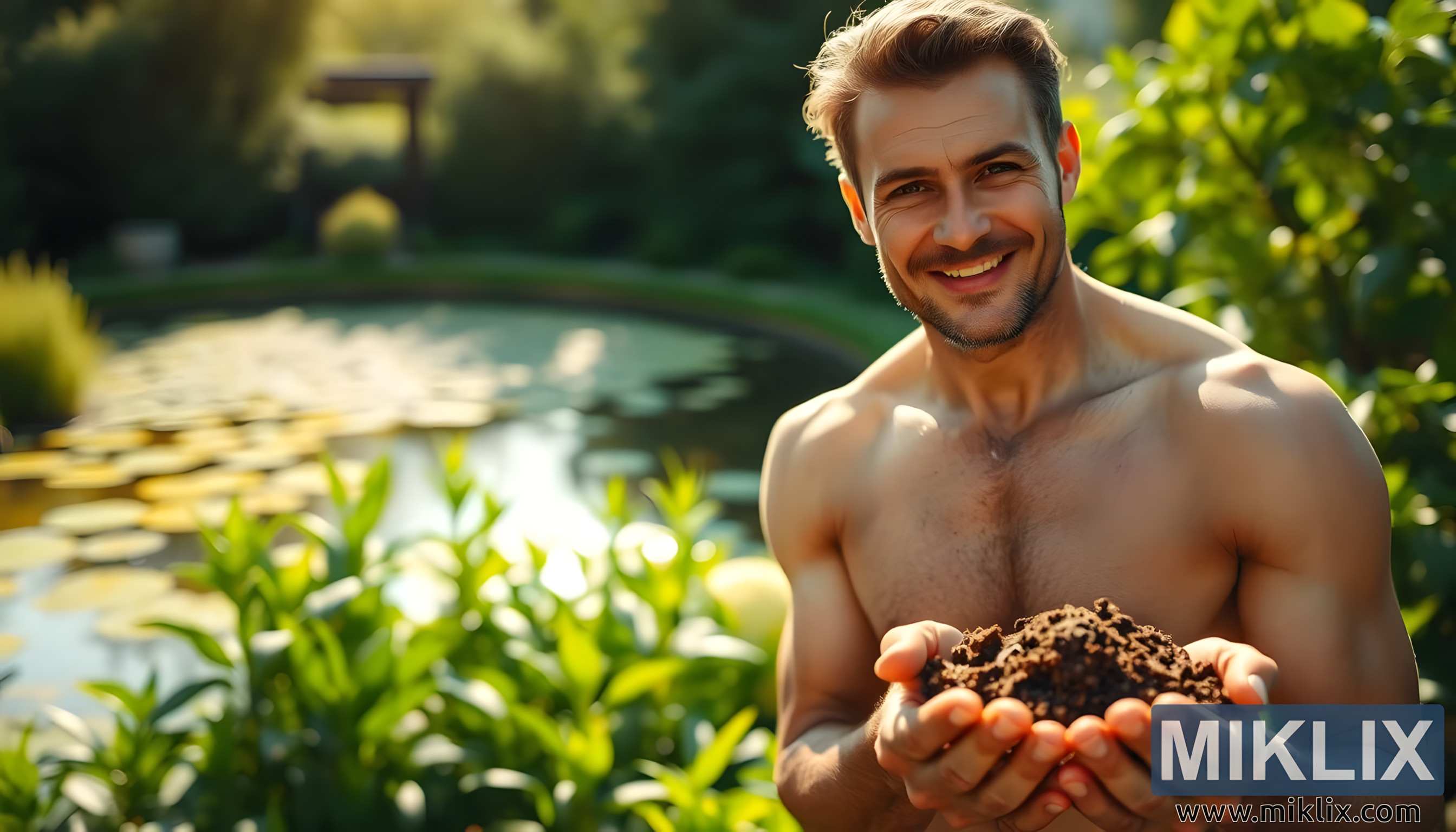 Onun arxasında səhnə genişlənir, onun səthi zanbaq yastıqları və suyun üzərində rəqs edən günəş işığı parıltıları ilə ləkələnmiş sakit gölməçəni ortaya qoyur. Hovuz həm onu əhatə edən yaşıllığı, həm də yaxınlıqda dayanan insanın sakit ruhunu əks etdirən güzgü rolunu oynayır. Torpaq və suyun bu tarazlığı, bəşəriyyət ondan ayrı durmaqdansa, təbii dövran çərçivəsində öz rolunu mənimsədikdə mövcud olan harmoniyanı vurğulayır. Canlı yarpaqları və bol böyüməsi ilə sulu yarpaqlar insanı demək olar ki, qeyri-adi bir tabloda çərçivəyə salır və onun özünün bu yaşıl ekosistemin bir hissəsi olduğunu göstərir. Hər bir element - torpaq, bitkilər, su və günəş işığı - yenilənmə, harmoniya və qarşılıqlı əlaqə mövzularını vurğulamaq üçün birləşir.
