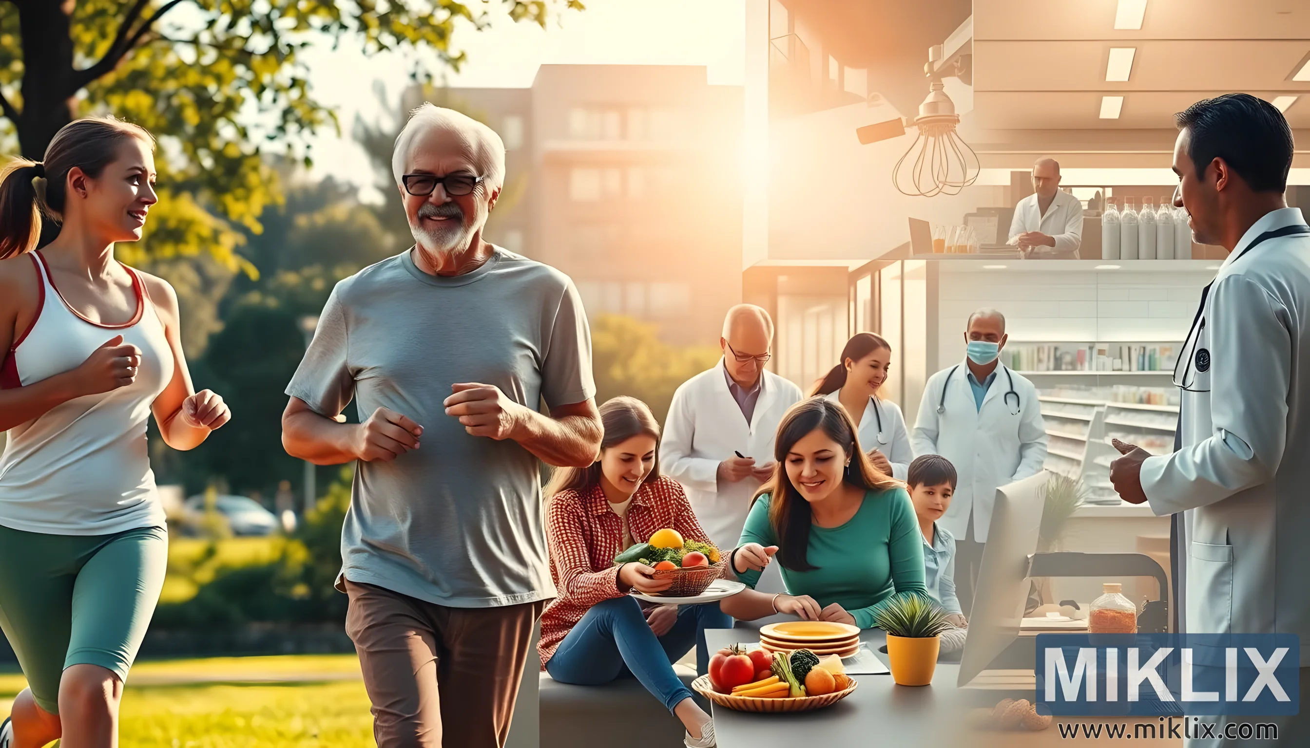 Şəkil N-Asetil L-Sistein (NAC) əlavəsindən faydalana biləcək insanların geniş spektrini vurğulamaq üçün müxtəlif nəsilləri, həyat tərzlərini və sağlamlıq kontekstlərini birləşdirən müasir həyatın parlaq və əhatəli panoramasını təqdim edir. Ön planda dirilik və hərəkət əzmlə qaçan gənc qadın və sevincli təbəssümlə cəld yeriyən yaşlı kişi ilə simvollaşdırılır. Onların mövcudluğu NAC-nin həm atletik performansı, həm də sağlam qocalmanı dəstəkləməkdə rolunu vurğulayır, gənclik enerjisi ehtiyaclarını daha sonra həyatda möhkəmliyin qorunmasının vacibliyi ilə əlaqələndirir. Onların aktiv hərəkəti yaxınlıqda oturan şəxslərin, məsələn, kompüterdə diqqətlə işləyən orta yaşlı bir insanın daha çox düşünən duruşu ilə ziddiyyət təşkil edir ki, NAC təkcə idmançılar və yaşlılar üçün deyil, həm də müasir oturaq işin fiziki stresslərini idarə edənlər üçün nəzərdə tutulub.