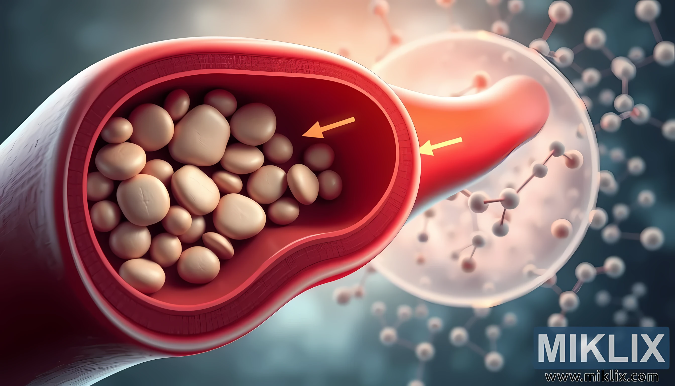 Arteriya divarının hamar, qırmızımtıl tonları solğun, demək olar ki, mirvari kimi xolesterol çöküntüləri ilə ziddiyyət təşkil edir, maneəni vizual olaraq dərhal və asan başa düşülür. Arterial strukturun təbəqələşməsi diqqətlə işlənir, daxili astar yığılan lövhə ilə incə, zərif bir səth kimi göstərilir. Bədənin təbii hamar yolları ilə invaziv yığılma arasındakı bu gərginlik, ateroskleroz, ürək xəstəliyi və ya insult kimi vəziyyətlərə gətirib çıxara bilən tədricən, lakin zərərli prosesi göstərir. İzləyicinin gözünü qan axını boyunca istiqamətləndirən oxlar hərəkət hissi yaradır, düzgün dövran üçün şəffaf, sağlam damarların saxlanmasının vacibliyini incə şəkildə gücləndirir.