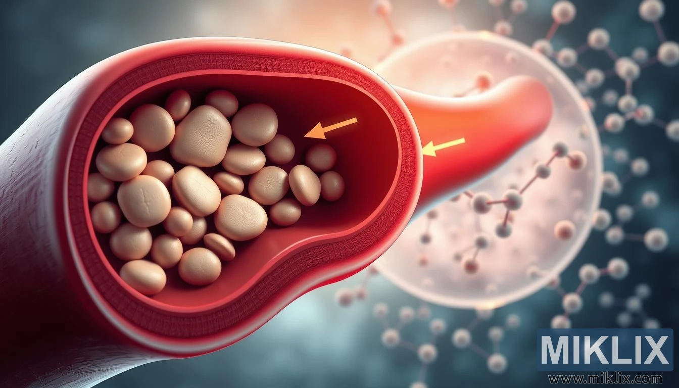 Xolesterolun idarə olunmasını vurğulayan müxtəlif xolesterol yataqları, qan axını və molekulyar strukturları olan arteriyanın ətraflı təsviri.