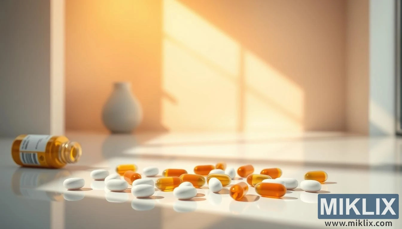 Bunun arxasında, orta zəmin minimal, lakin cəlbedici bir mühitə malikdir. Yumşaq şəkildə bulanıqlanmış keramika vaza, başqa cür təmiz və müasir kompozisiyaya üzvi və səliqəli toxunuş əlavə edərək, gözə dəymir. Divarlar yumşaq tonlarla yuyulur, hamar səthləri yalnız pəncərədən daxil olan günəş işığının isti parıltısı ilə kəsilir. Pəncərədən gələn işıq və kölgə oyunu incə naxışlar yaradır, təsvirə təbii sakitlik və tarazlıq hissi verir. Bu işıqlandırma seçimi kapsulların və tabletlərin toxunma keyfiyyətlərini artırır, onların formasını və şəffaflığını vurğulayır, eyni zamanda bütün səhnəni qızılı hərarətlə doldurur.