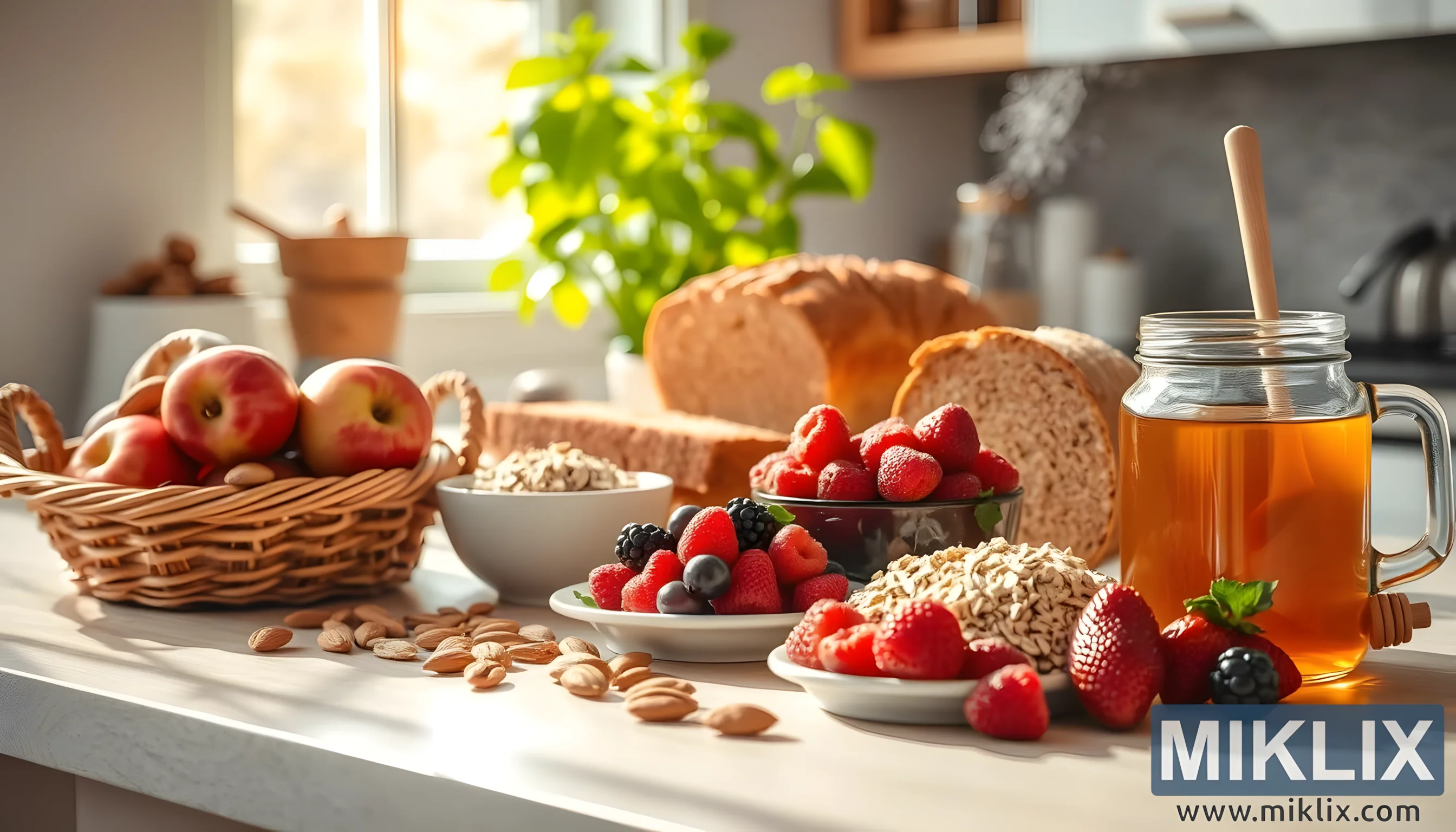 D-ribozun təbii qida mənbələrini vurğulayan alma, badam, giləmeyvə, yulaf, çörək və çiy balın günəşli sayğacda yüksək keyfiyyətli səhnəsi.