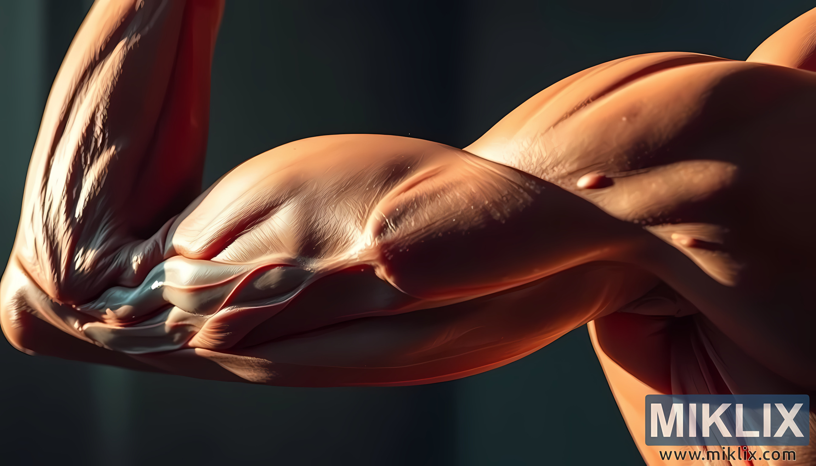 Aktiv toxuma təmirini, əzələ liflərini, bədənin gücünü və bərpaedici qabiliyyətini vurğulayan əzələ qolunun ətraflı görünüşü.
