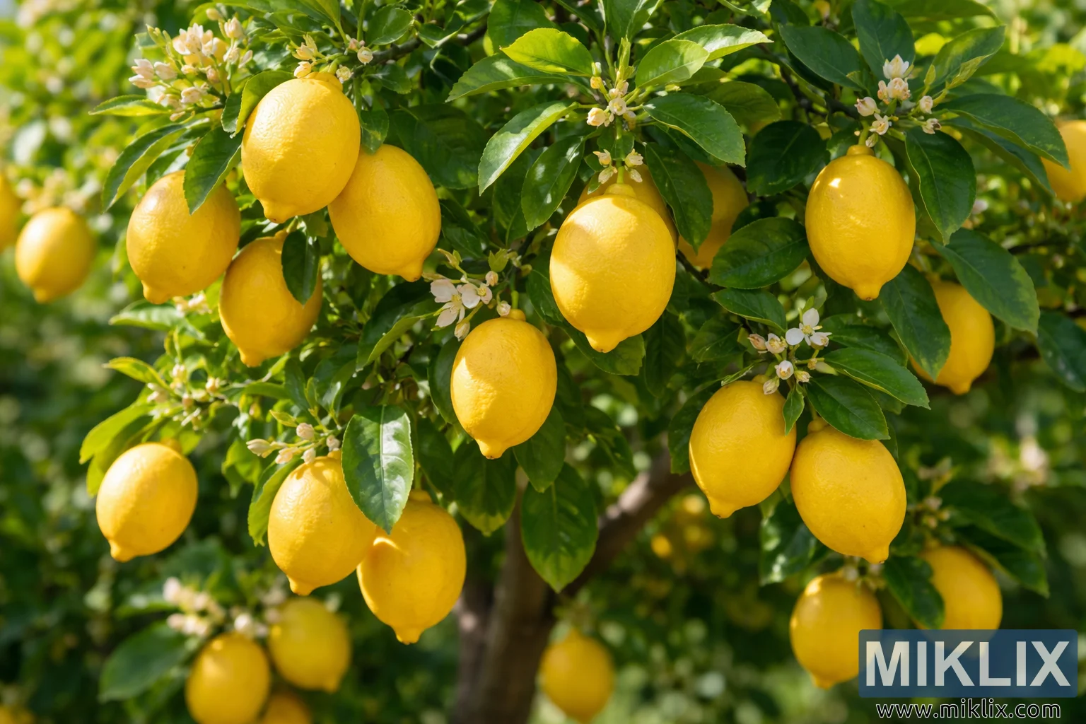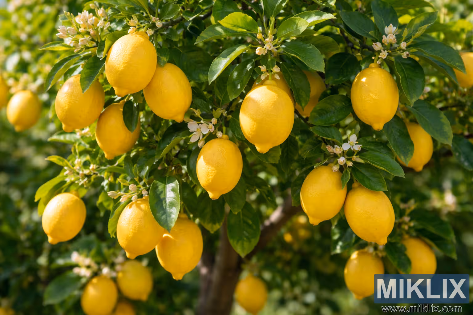 Изображението представя богато детайлен, осветен от слънцето изглед на зряло лимоново дърво Eureka, заснето в пейзажна ориентация. Дървото е гъсто покрито с лъскави, наситенозелени листа, които образуват жизнена корона, през която нежно се процежда топла естествена светлина. Многобройни зрели лимони висят видно от клоните, като техните удължени овални форми и ярък, наситен жълт цвят веднага привличат погледа. Лимоните варират леко по размер и ориентация, някои са струпани заедно, докато други висят поотделно, създавайки естествен ритъм в цялата композиция. Текстурираните им кори изглеждат твърди и здрави, леко вдлъбнати и привличат акценти там, където слънчевата светлина попада върху извитите им повърхности. Разпръснати сред плодовете са малки, нежни цитрусови цветове и неотворени пъпки. Цветовете са бели с нотки на бледо кремаво, а някои пъпки показват лек розов оттенък, добавяйки мекота и визуален контраст към смелите жълти плодове и тъмната зеленина. Тънки стъбла и дървесни клони са частично видими под листата, заземявайки сцената и подсилвайки впечатлението за процъфтяващо, продуктивно дърво. Фонът е меко размазан, което предполага допълнителна зеленина и градинска обстановка, без да разсейва от основния обект. Тази малка дълбочина на рязкост засилва яснотата и изпъкналостта на лимоните и листата на преден план. Като цяло, изображението предава свежест, изобилие и жизненост, предизвиквайки аромата на цитрусови плодове и топлината на слънчева овощна градина или градина в задния двор. Композицията изглежда естествена и балансирана, подходяща за използване в селскостопански, ботанически, кулинарен или лайфстайл контекст, където са желани теми за свежест, растеж и естествени продукти.