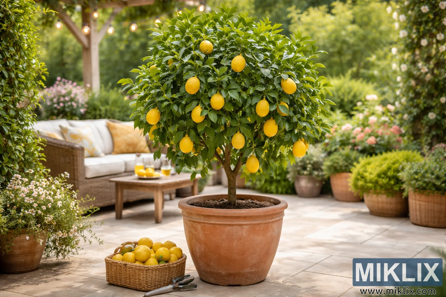Изображение с висока резолюция на процъфтяващо лимоново дърво в теракотена саксия на осветена от слънцето тераса, заобиколено от буйна зеленина, градински мебели и спокойна атмосфера на открито.