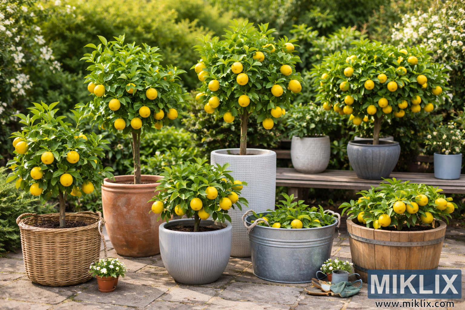 Изображение на пейзаж с висока резолюция, илюстриращо различни варианти за контейнери за лимонови дървета, включително теракотени, керамични, дървени, бетонни, платнени и каменни саксии, подредени в градинска обстановка.