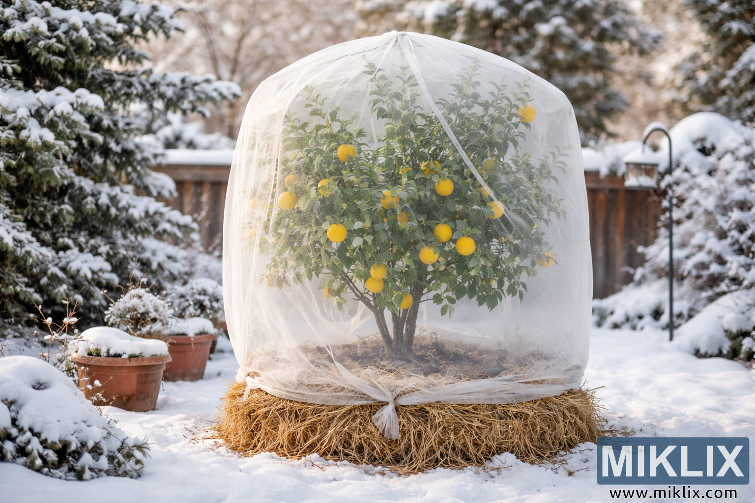 Зимна градина, показваща лимоново дърво, защитено от мразовита кърпа, заобиколено от сняг, вечнозелени дървета и градински елементи, подчертаващи грижата за цитрусовите плодове в студено време.