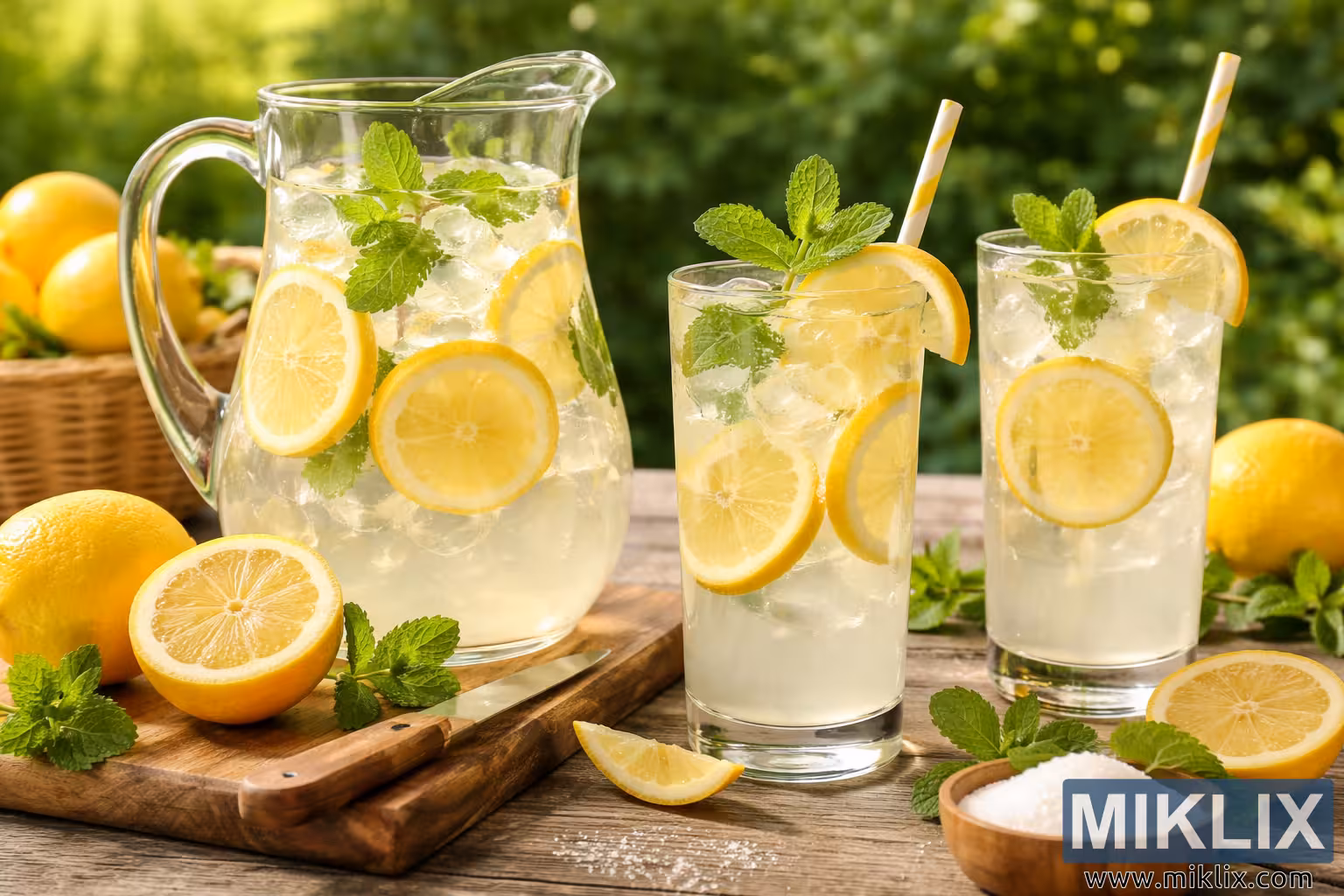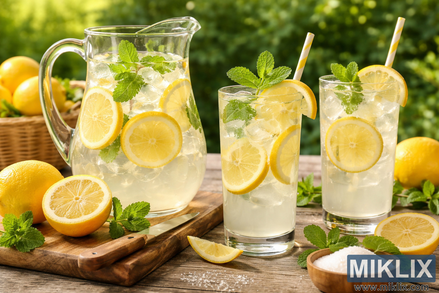 Снимка с висока резолюция на домашно приготвена лимонада с пресни лимони, мента и лед, стилизирана върху рустикална дървена маса в светла външна обстановка.