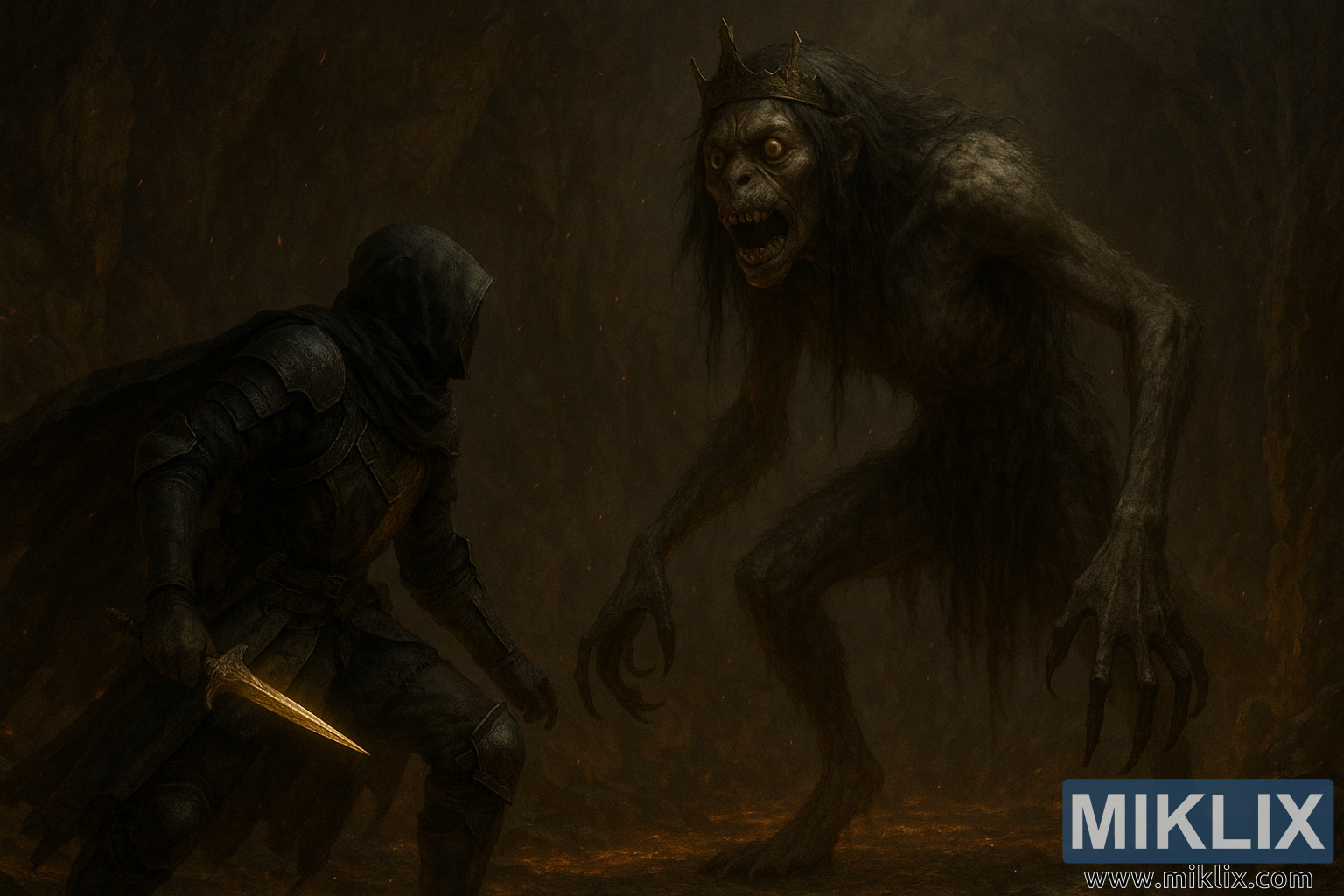 Мрачно, реалистично фентъзи изобразяване на Помрачените, борещи се с извисяващата се получовешка кралица Марго във Вулканичната пещера на Елдън Ринг, осветена от разтопена светлина.