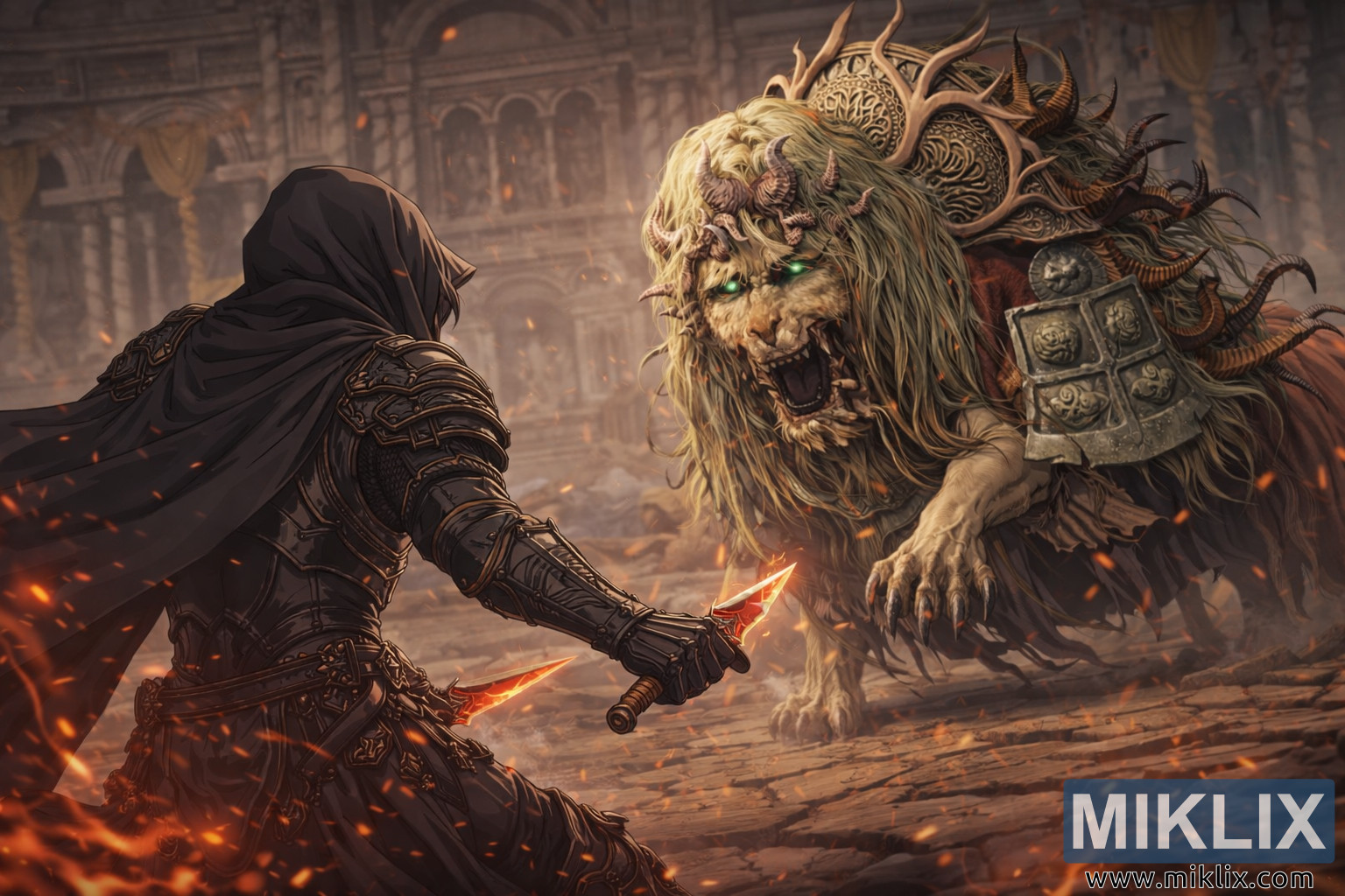 Фен арт с висока резолюция, изобразяващ Потъмнелия в броня с черен нож, биещ се с Танцуващия лъв на Божествения звяр сред огнени искри и древни руини на Елденския пръстен.