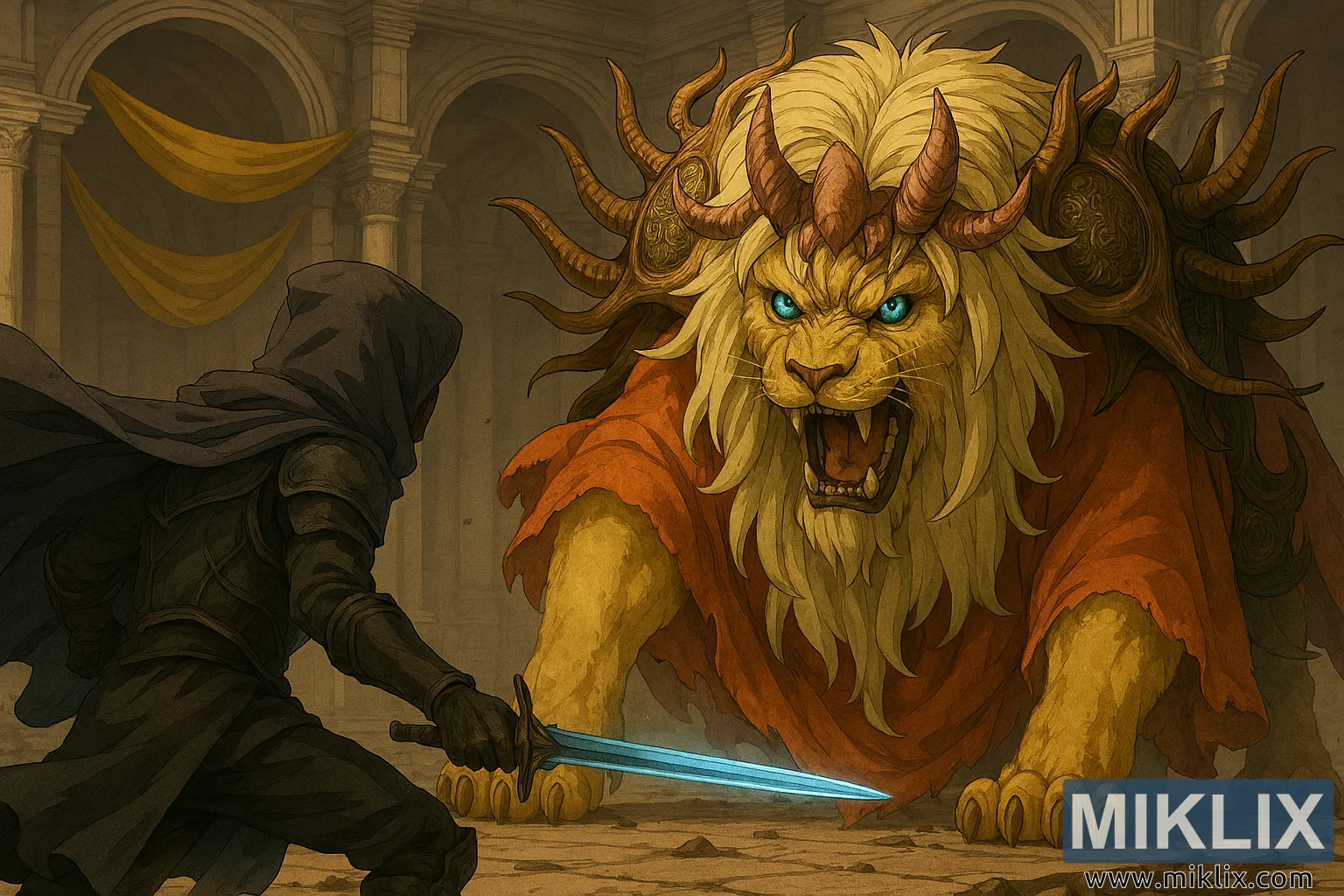 От дясната страна се извисява Божественият Звяр Танцуващият Лъв, фантастично същество с лъвско лице, блестящи тюркоазени очи и грива от заплетена, мръсноруса коса, преплетена с усукани рога. Рогата варират по форма и размер - някои приличат на рога, други къси и назъбени. Изражението на звяра е свирепо и първично, устата му е широко отворена в рев, който разкрива остри зъби и тъмно гърло. Червено-оранжева наметало се спуска върху масивните му рамене и гръб, частично скривайки богато украсена, бронзово оцветена черупка, украсена с вихрушки и назъбени, подобни на рога издатини. Мускулестите му крайници завършват с ноктисти лапи, които се вкопчват със сила в напуканата земя.