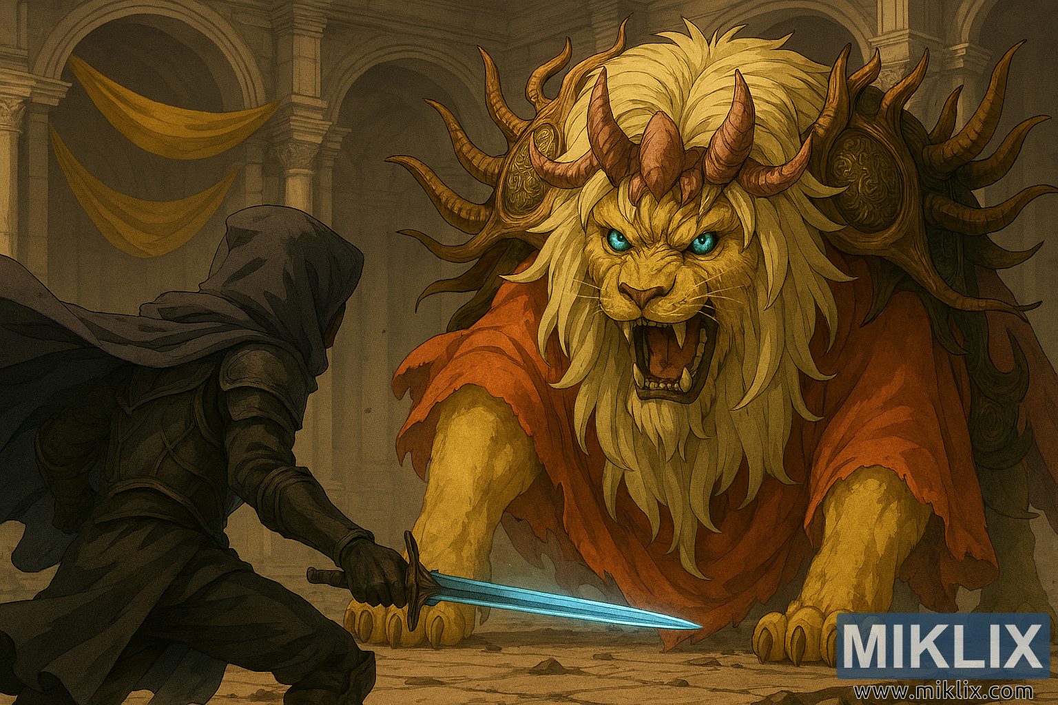 Изобразена в полуреалистичен аниме стил, картината демонстрира прецизно изпипани детайли във всеки елемент: гривата и рогата на съществото, бронята и оръжието на воина и архитектурното величие на обстановката. Сцената извиква теми за митична конфронтация, смелост и завладяващата красота на фентъзи света на Elden Ring, което я прави завладяващ трибют както за фенове, така и за колекционери.