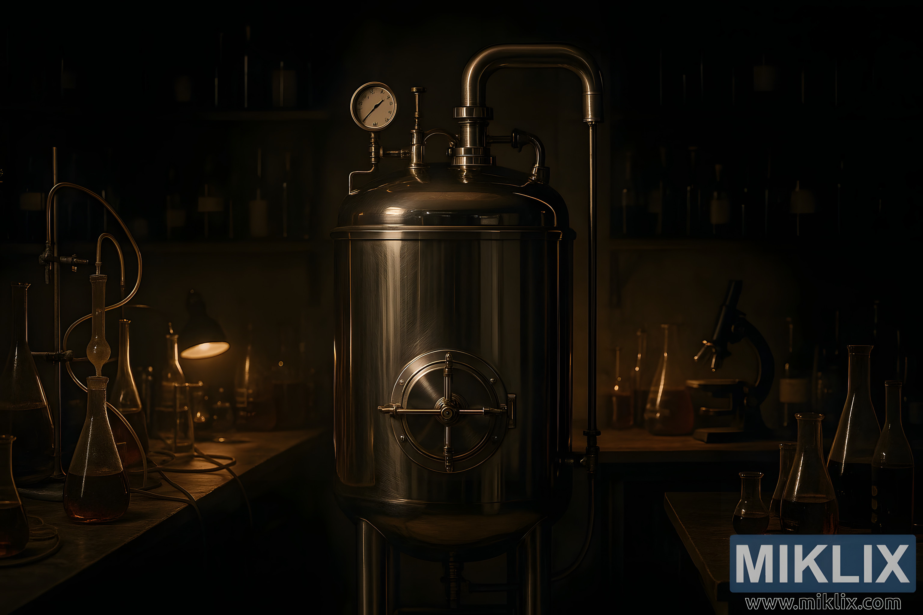 В слабо осветена лаборатория, полиран хромиран ферментационен резервоар блести сред рафтове със стъклени съдове и мека кехлибарена светлина, извикавайки едновременно научна прецизност и артистичност на ферментацията.