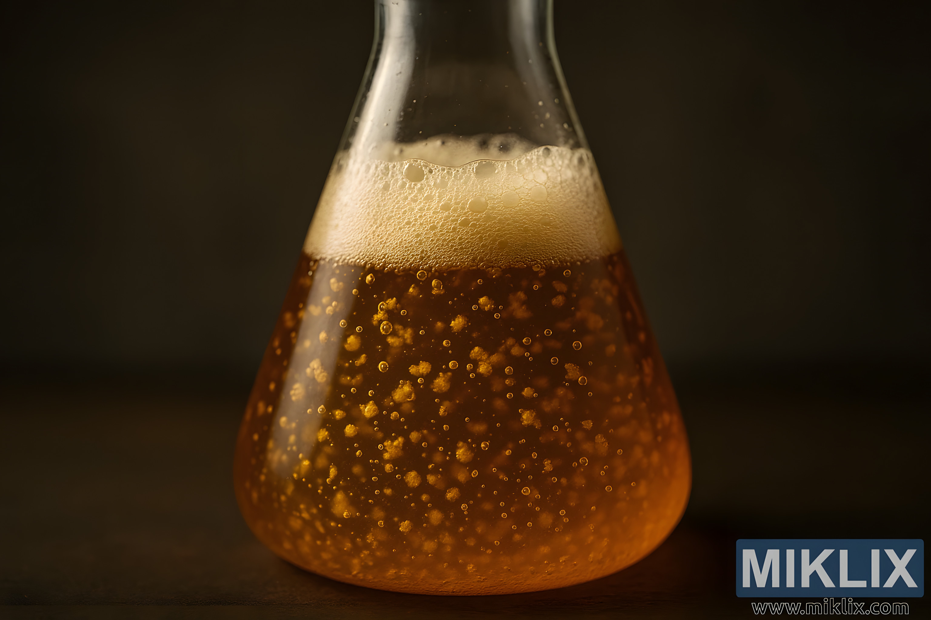 Изображението представя интимен и щателно детайлен поглед върху научен и занаятчийски процес, уловен в най-изразителния му момент: ферментацията в действие. Доминираща част от композицията е прозрачна стъклена Ерленмайерова колба, чиито елегантни извивки блестят нежно под разсеяна, топла светлина. Колбата е пълна със златиста, ефервесцентна течност - жива напитка, която сякаш пулсира с тиха жизненост. В нея безброй малки мехурчета се издигат и вихрят, носейки със себе си частици мая, окачени в грациозно, хаотично движение. Тези частици, осветени от финото взаимодействие на светлина и сянка, създават хипнотично усещане за дълбочина и текстура. Те извикат както микроскопичния мащаб на биологичната активност, така и по-широкия разказ за човешката изобретателност, която я използва.