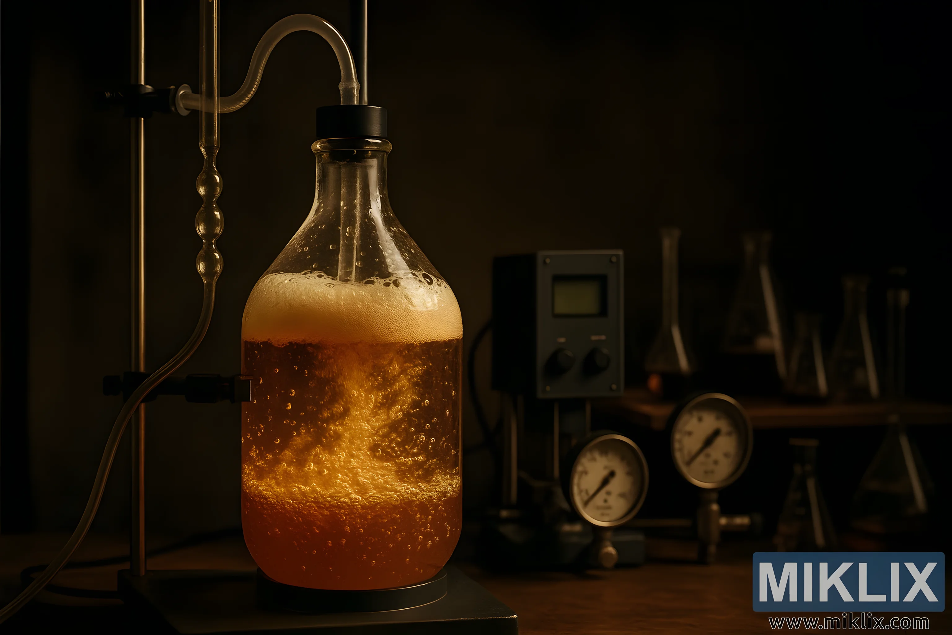 Изглед отблизо на лабораторен ферментационен съд, в който активно кипи кехлибарена течност под топла, кехлибарена светлина. Заобиколен от измервателни уреди, колби и инструменти, сцената предава научна прецизност и динамичната енергия на ферментацията с дрожди.