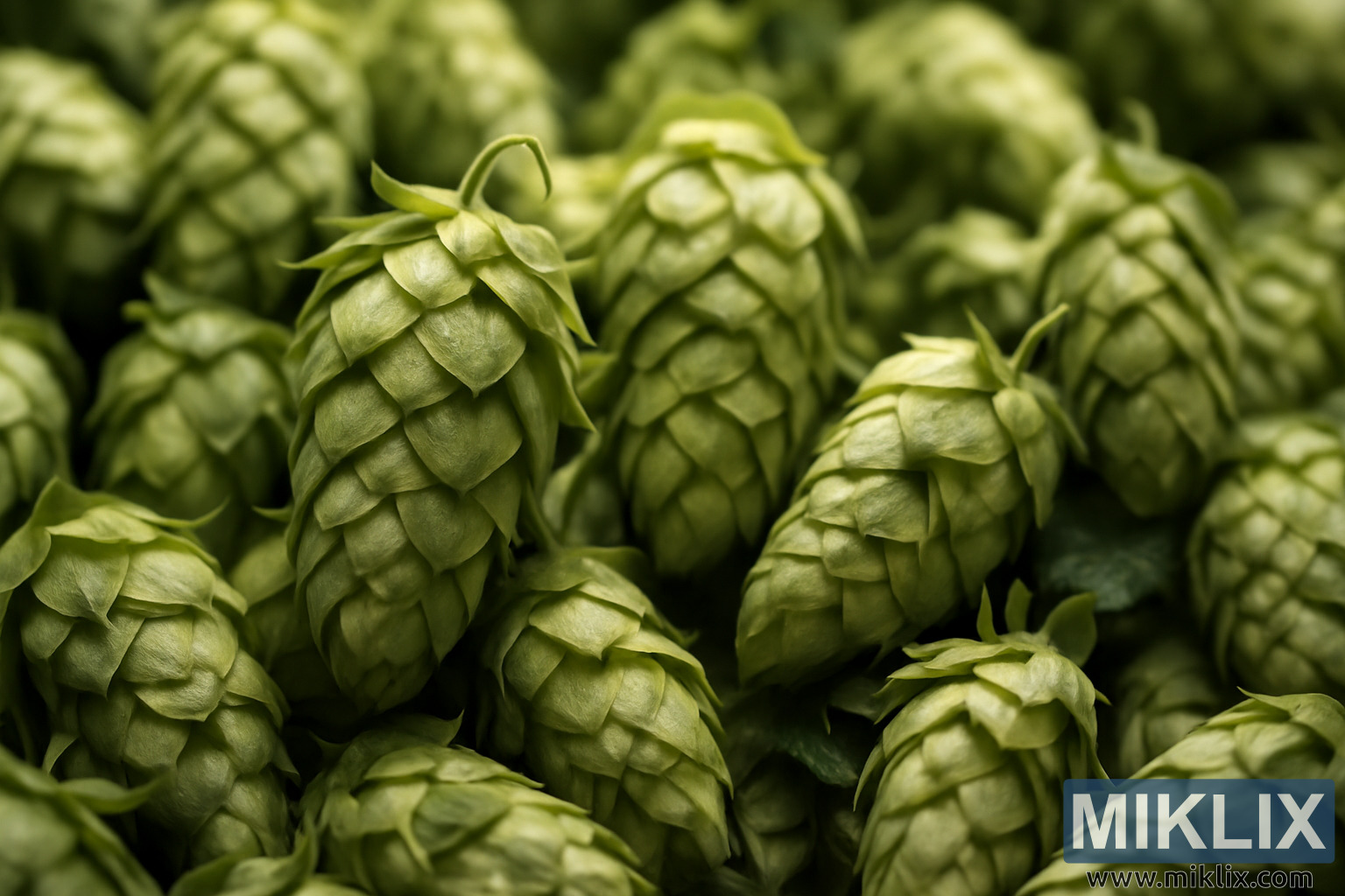 Хмелът на преден план е изобразен с рязък фокус, подчертавайки неговата структура и тактилни качества, докато фонът прелива в плавно, естествено размазване. Тази малка дълбочина на рязкост привлича погледа на зрителя директно към централните шишарки и подчертава тяхната важност в процеса на варене. Размазаният фон все още загатва за по-голямо легло от хмел, подсилвайки впечатлението за изобилна реколта.