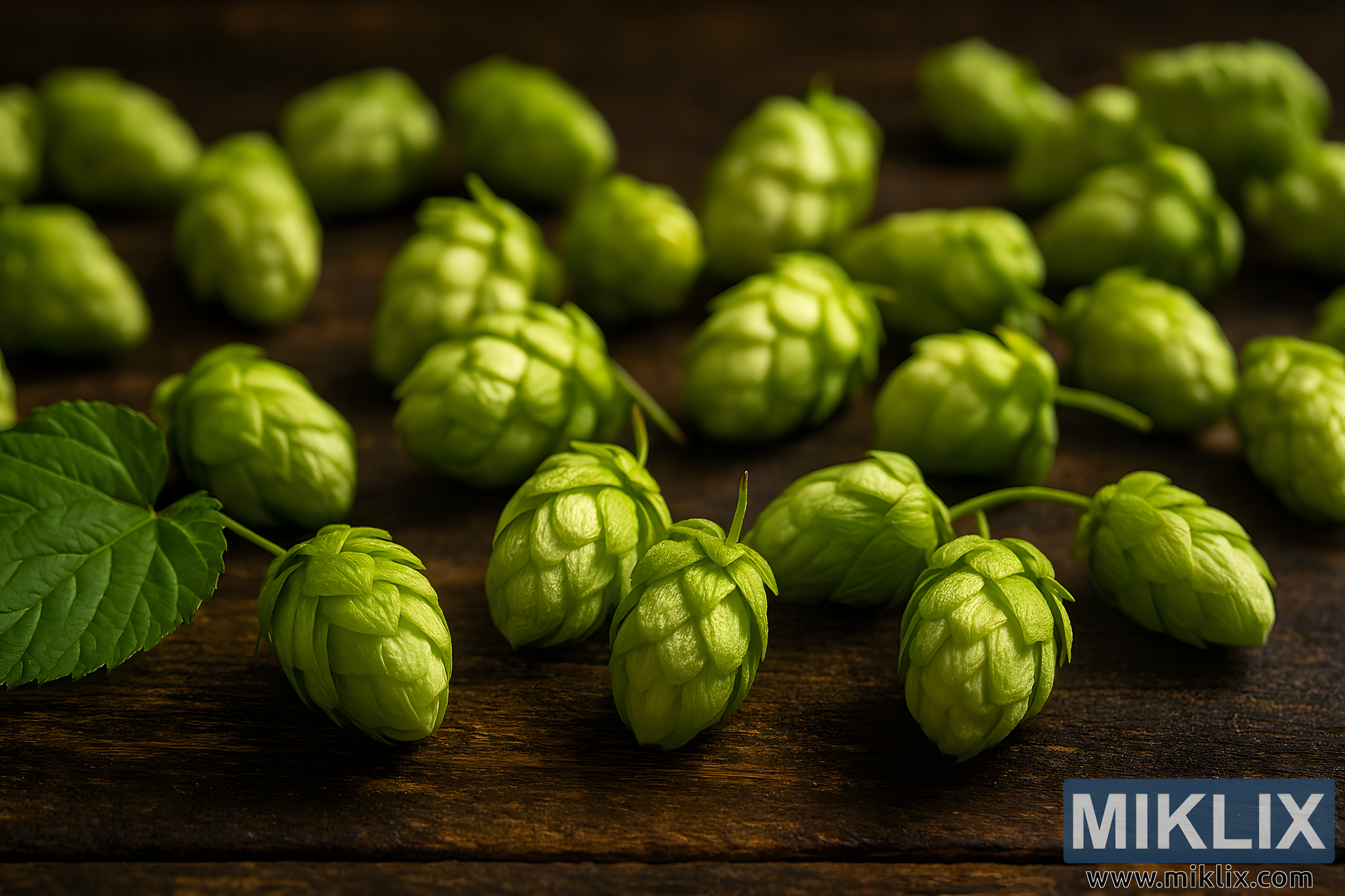 Снимка с висока резолюция, в пейзажен формат, представя прясно набрани шишарки от хмел от сорта Викинг, подредени върху рустикална, тъмнокафява дървена маса. Композицията подчертава близки, тактилни детайли: шишарките са струпани на преден план с ясен, остър фокус, докато допълнителни шишарки и листа се отдалечават в нежно размазване, създавайки естествено усещане за дълбочина. Всяка шишарка от хмел показва плътно припокриващи се прицветници и брактеоли, чиито люспи са леко полупрозрачни на върховете, преминавайки от ярко пролетно зелено до по-дълбоко нефритено близо до основата. Миниатюрни нотки на лупулин - златист прах, хванат във вътрешността на шишарката - предполагат сила и свежест, без да се разливат открито в полезрението.