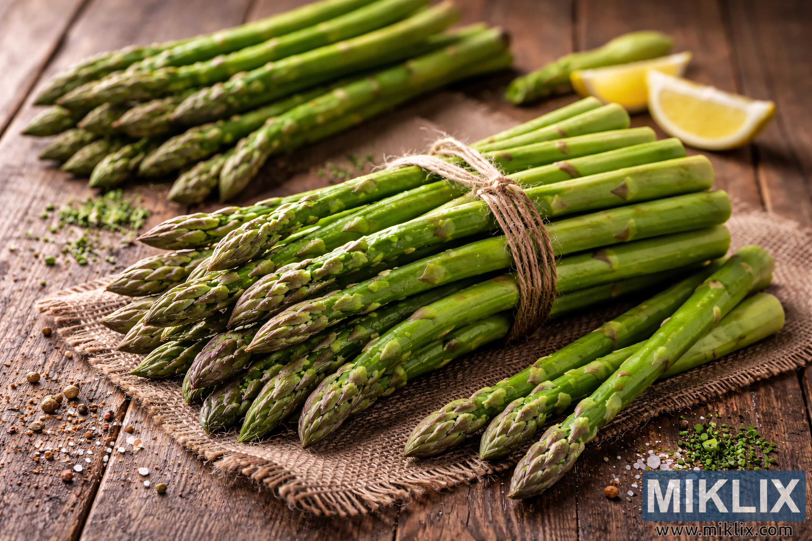Хранителна снимка с висока резолюция на пресни зелени аспержи, аранжирани върху рустикална дървена маса с чул, канап, резенчета лимон и подправки на топла естествена светлина.