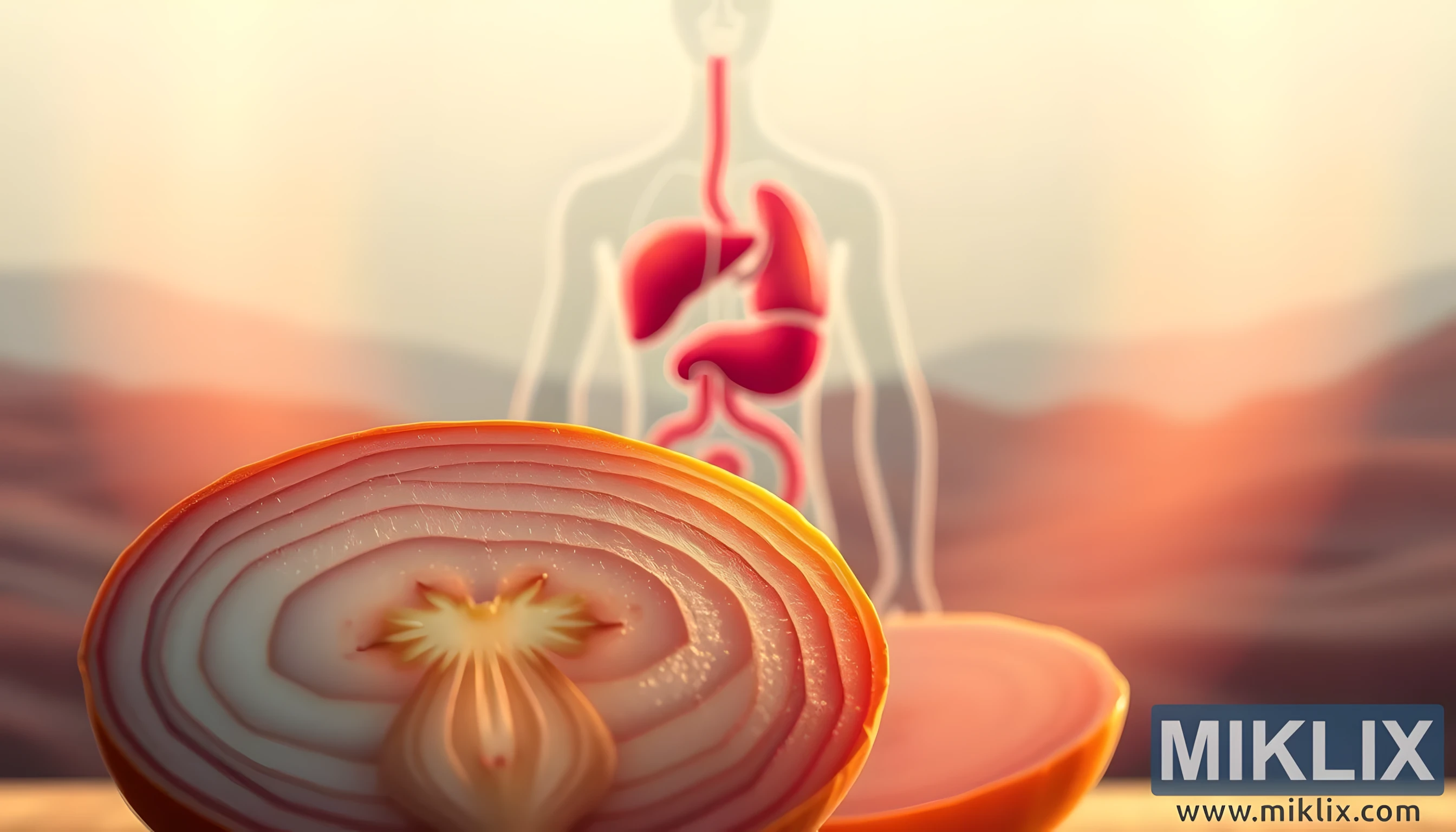 В крайна сметка, това изображение надхвърля ролята си на просто изобразяване на лук и се превръща в емблема на баланс и жизненост. Чрез съпоставяне на хрупкавия, златист лук със символичните органи на метаболизма, то напомня на зрителите, че дори най-обикновените храни могат да играят изключителна роля за поддържането на благополучието. Топлото осветление, органичните текстури и плавният фон допринасят за усещане за хармония, правейки изображението не само визуално привлекателно, но и интелектуално и емоционално резониращо. То улавя същността на лука като нещо повече от основна съставка – той е изобразен като естествен партньор в търсенето на балансирано здраве и устойчива енергия.