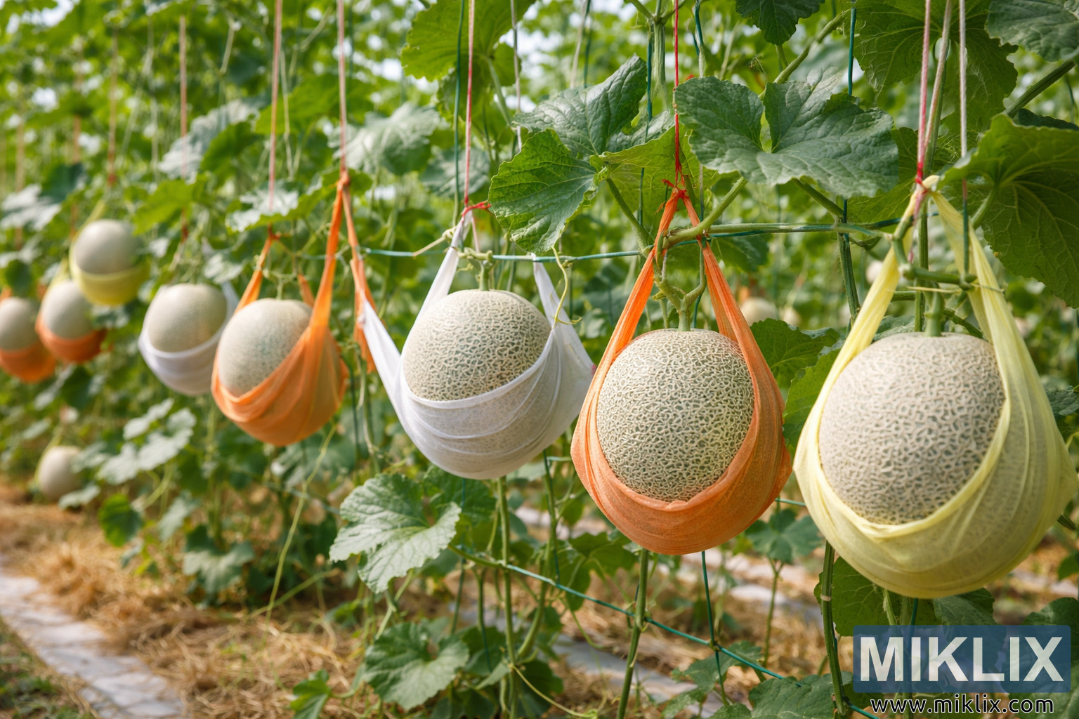 Cantaloupe Melons Growing on a Trellis with Support Slings