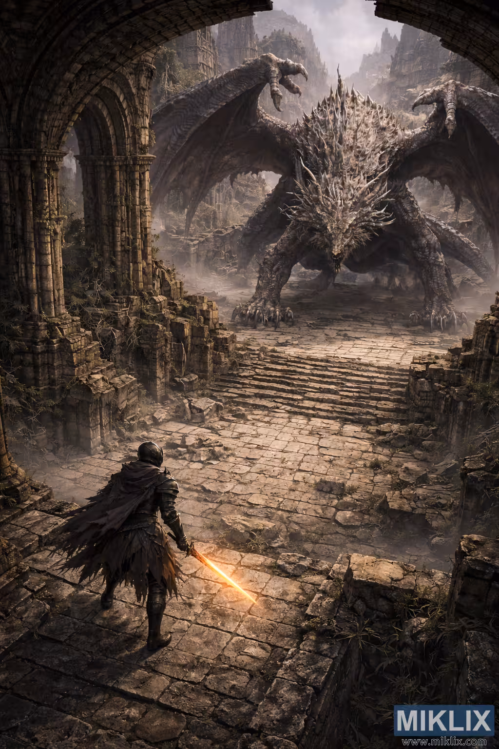 এই উচ্চ-রেজোলিউশনের অন্ধকার ফ্যান্টাসি ডিজিটাল চিত্রটি একটি গথিক ক্যাথেড্রাল শহরের ছিন্নভিন্ন ধ্বংসাবশেষের মধ্যে একটি একাকী সাঁজোয়া নাইট এবং একটি বিশাল প্রাচীন ওয়াইভার্নের মধ্যে একটি নাটকীয় যুদ্ধ-পূর্ব সংঘর্ষ উপস্থাপন করে, যা একটি টানা, উন্নত আইসোমেট্রিক দৃষ্টিকোণ থেকে দেখা হয়। ক্যামেরার কোণটি ঐতিহ্যবাহী চোখের স্তরের রচনার তুলনায় লক্ষণীয়ভাবে উচ্চ এবং আরও দূরে, যা দর্শককে কৌশলগত, প্রায় কৌশলগত স্পষ্টতার সাথে চরিত্র এবং আশেপাশের স্থাপত্য উভয়কেই পর্যবেক্ষণ করতে দেয়। এই সুবিধাজনক বিন্দুটি পরিবেশের বিশালতা এবং যোদ্ধা এবং বিশাল জন্তুটির মধ্যে অপ্রতিরোধ্য স্কেল পার্থক্যের উপর জোর দেয় এবং জটিল পরিবেশগত বিবরণও প্রকাশ করে যা অন্যথায় লুকিয়ে থাকত।