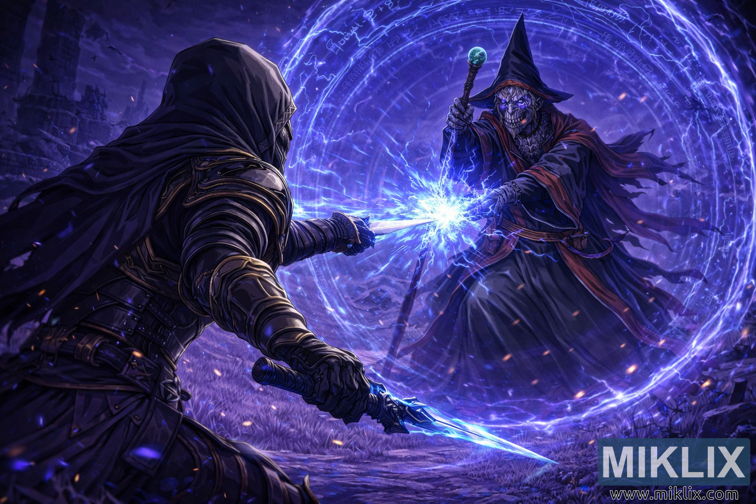 ছুরি এবং মন্ত্রের সংঘর্ষ ছবির দৃশ্যমান হৃদয় গঠন করে। সেই এক বিন্দুতে, নীল বিদ্যুৎ ক্ষতবিক্ষত টেন্ড্রিলের মধ্যে বাইরের দিকে ফেটে পড়ে, যা উভয় যোদ্ধাকে একটি কঠোর, বৈদ্যুতিক আভায় আলোকিত করে। কাঁধের উপরে ফ্রেমিং দর্শককে আক্রমণে সহযোগী বোধ করায়, যেন কলঙ্কিতের জায়গায় দাঁড়িয়ে আছে, যুদ্ধজাদুকরের শক্তির শক্তির জন্য প্রস্তুত। সামগ্রিক মেজাজ সৌন্দর্য এবং বর্বরতার ভারসাম্য বজায় রাখে, হিংসাত্মক যুদ্ধের একটি মুহূর্তকে সময়ের সাথে সাথে জমাট বাঁধা এক ট্র্যাজিক, উচ্চ-কল্পনা দৃশ্যে রূপান্তরিত করে।