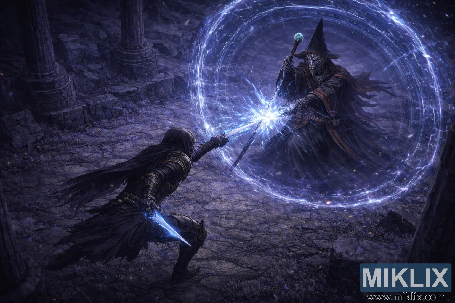 যেখানে ব্লেড এবং মন্ত্রের মিলন হয়, সেখানে সংঘর্ষ তীব্র কিন্তু স্থির থাকে। বিস্ফোরক আতশবাজির পরিবর্তে, আঘাতের ফলে আলোর ঝাঁকুনি এবং তীক্ষ্ণ স্ফুলিঙ্গ নির্গত হয় যা পাথরের মেঝেতে ছড়িয়ে পড়ে, প্রকৃত অঙ্গারের মতো লাফিয়ে লাফিয়ে এবং নিভে যায়। সংঘর্ষের চারপাশের মাটি ছোট ছোট ফাটল দিয়ে খোদাই করা হয়েছে, এবং পাথরের ফাঁক দিয়ে উপরে উঠে আসা ল্যাভেন্ডার ঘাসটি যেন কোনও অদৃশ্য শক্তির চাপে সমতলভাবে বেঁকে যায়।