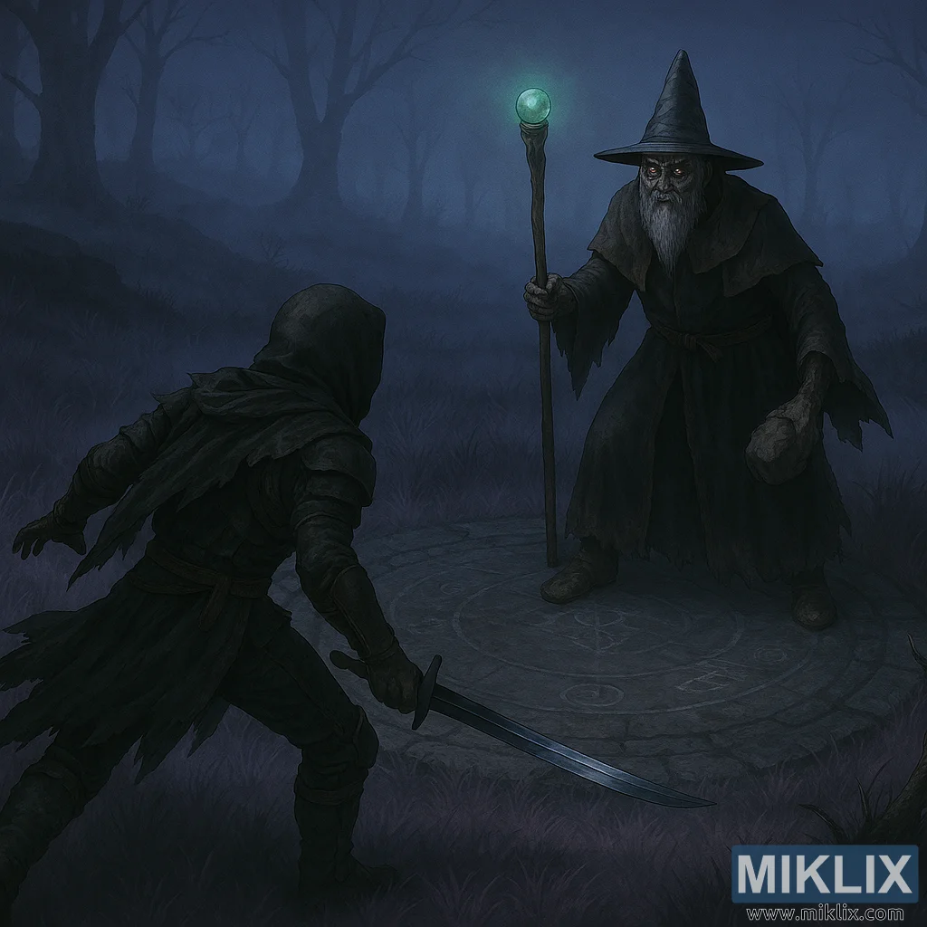 তার বিপরীতে, ব্যাটলমেজ হিউগেস পাথরের বৃত্তের মধ্যে লম্বা এবং মনোমুগ্ধকরভাবে দাঁড়িয়ে আছে। তার লম্বা, গাঢ় বেগুনি রঙের পোশাকের কিনারা ছিঁড়ে গেছে এবং কোমরে ফাটা চামড়ার বেল্ট দিয়ে আটকানো। একটি লম্বা, সূক্ষ্ম কালো টুপি তার কঙ্কালের মাথার মুকুট, তার দুর্বল, দাড়িওয়ালা মুখের উপর ছায়া ফেলে। তার চোখ একটি বিদ্বেষপূর্ণ হলুদ আলোয় জ্বলজ্বল করছে, এবং তার অভিব্যক্তি এক ভয়াবহ দৃঢ়তার। তার বাম হাতে, সে একটি কাঠের লাঠি তুলে ধরেছে যার উপরে একটি উজ্জ্বল সবুজ গোলক রয়েছে, যা তার পোশাক এবং চারপাশের কুয়াশা জুড়ে ভয়ঙ্কর আলোকসজ্জা ছড়িয়ে দেয়। তার ডান হাতে একটি খাঁজকাটা পাথরের অস্ত্র ধরে আছে, যা নিচু এবং প্রস্তুত।
